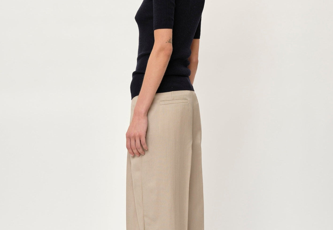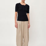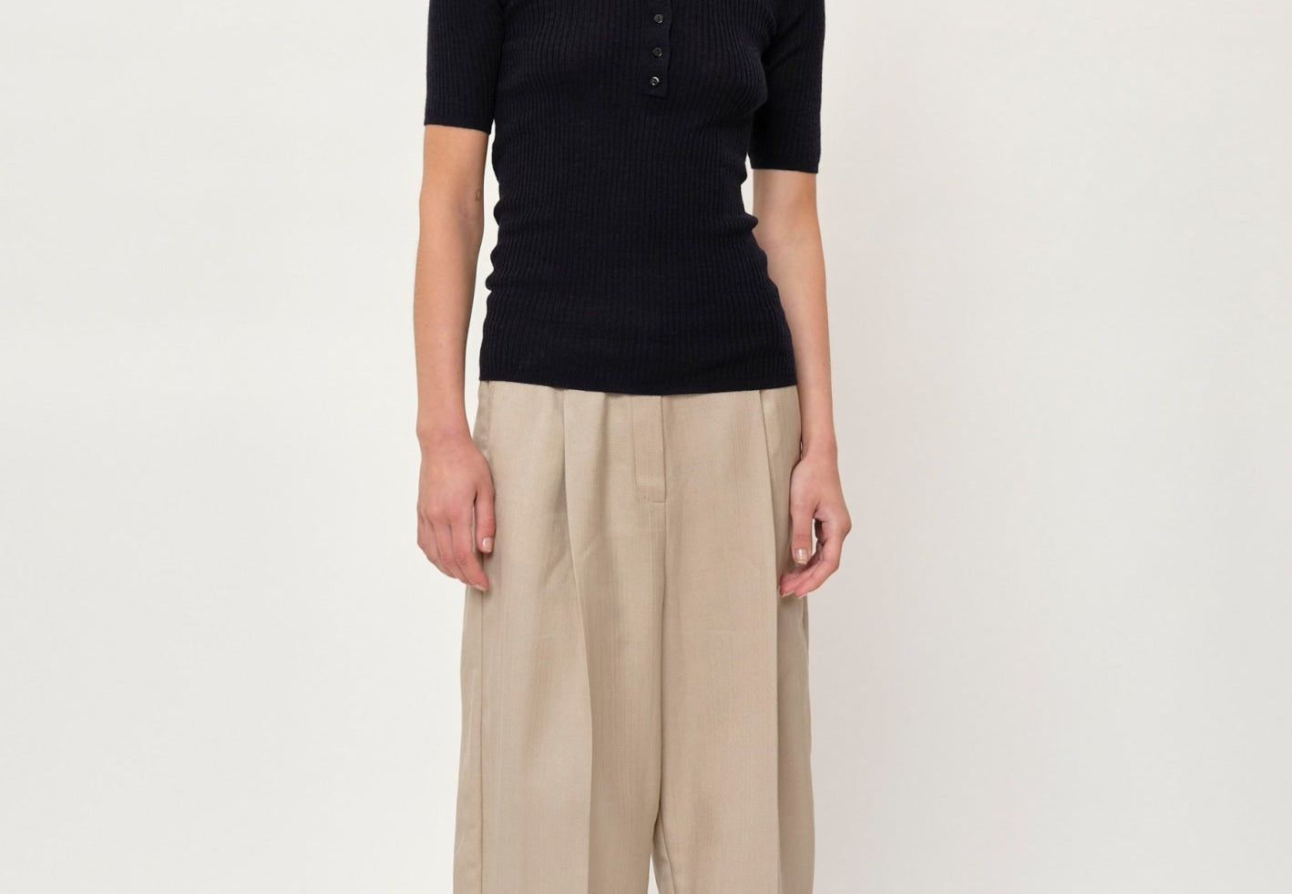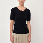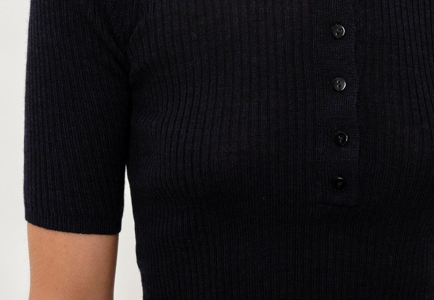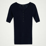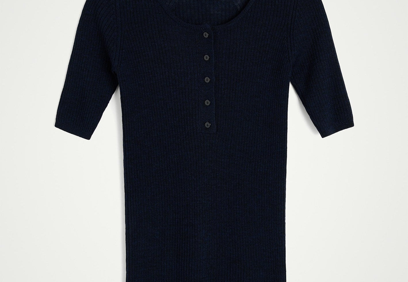 Introducing the Agnes Knit Blouse: A fitted knit blouse featuring a ribbed texture, half-length sleeves, and a button closure at the front.