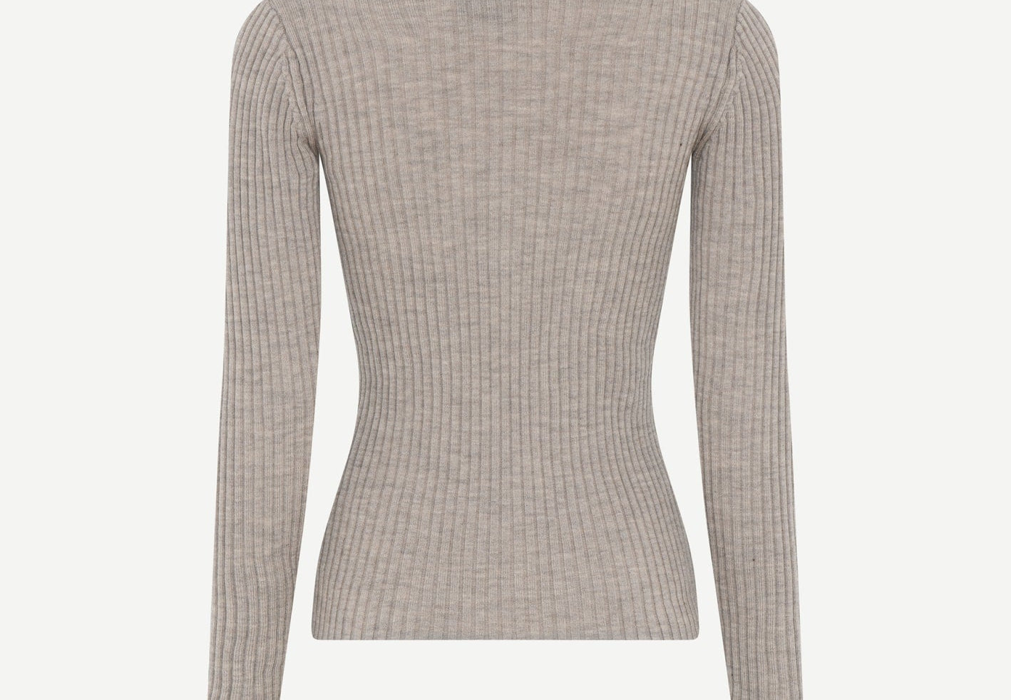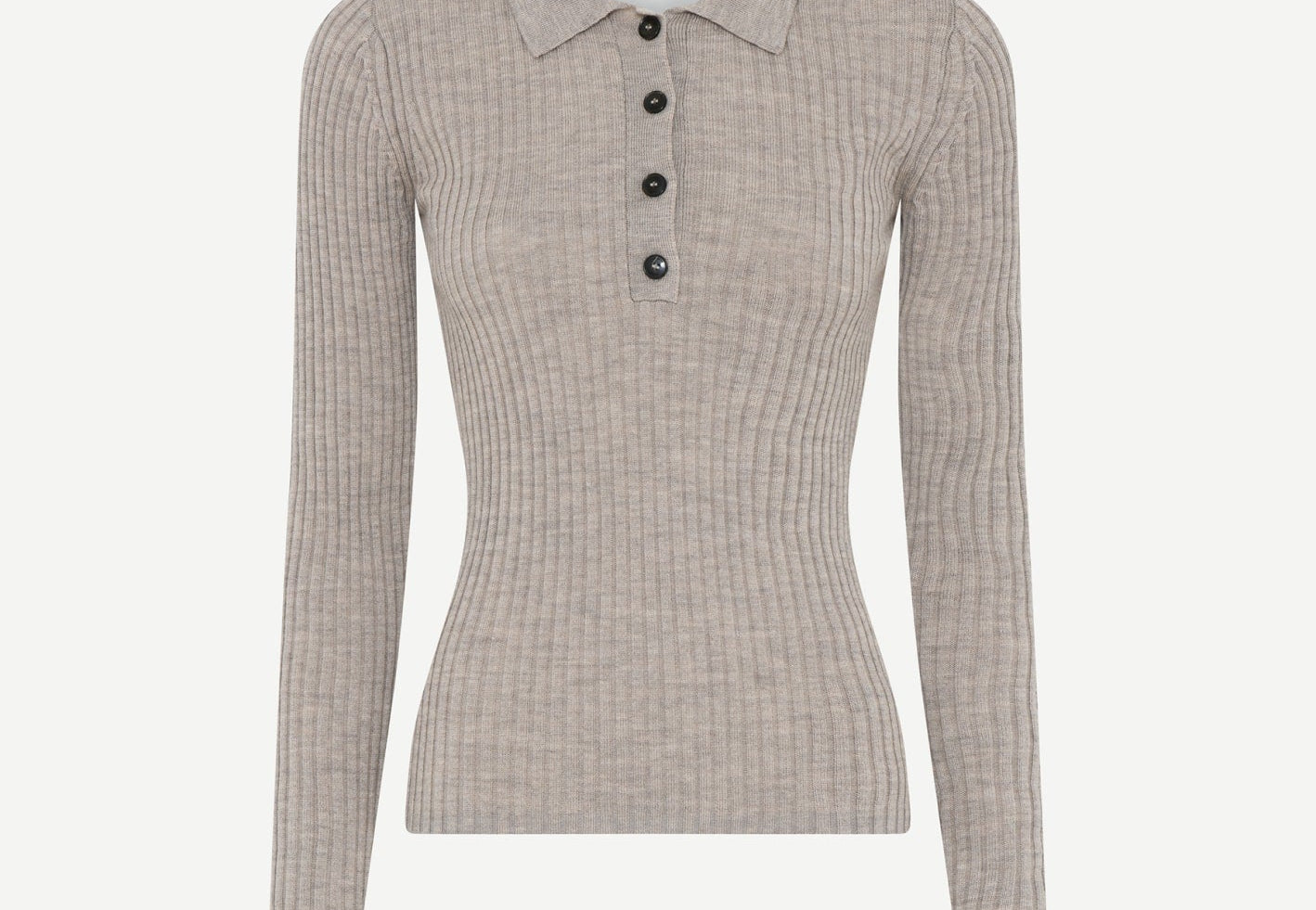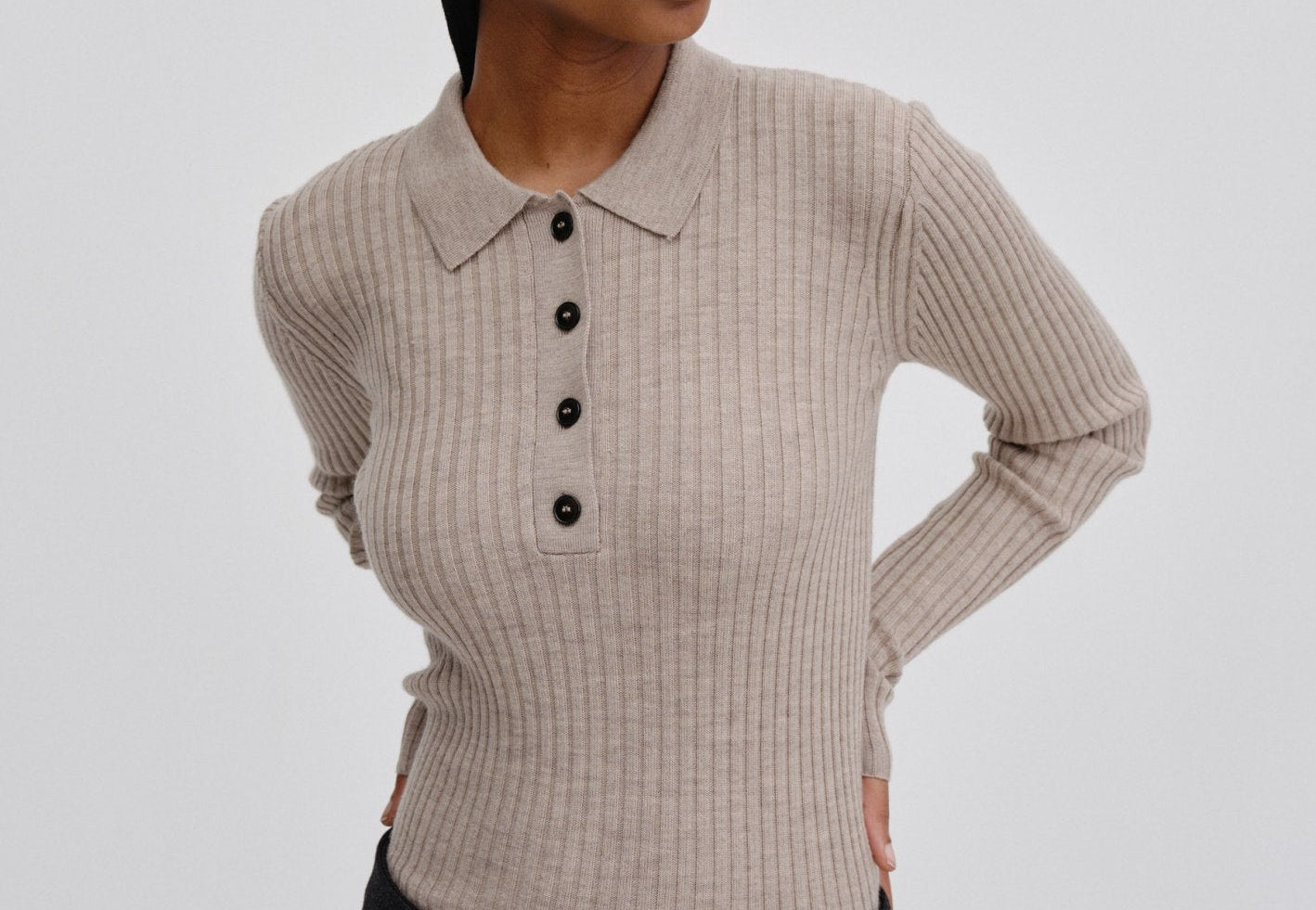 Our polo neck blouse, crafted in 2x2 rib with a slim fit and regular length, offering a stylish addition to your wardrobe.