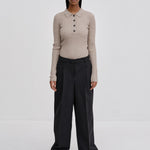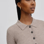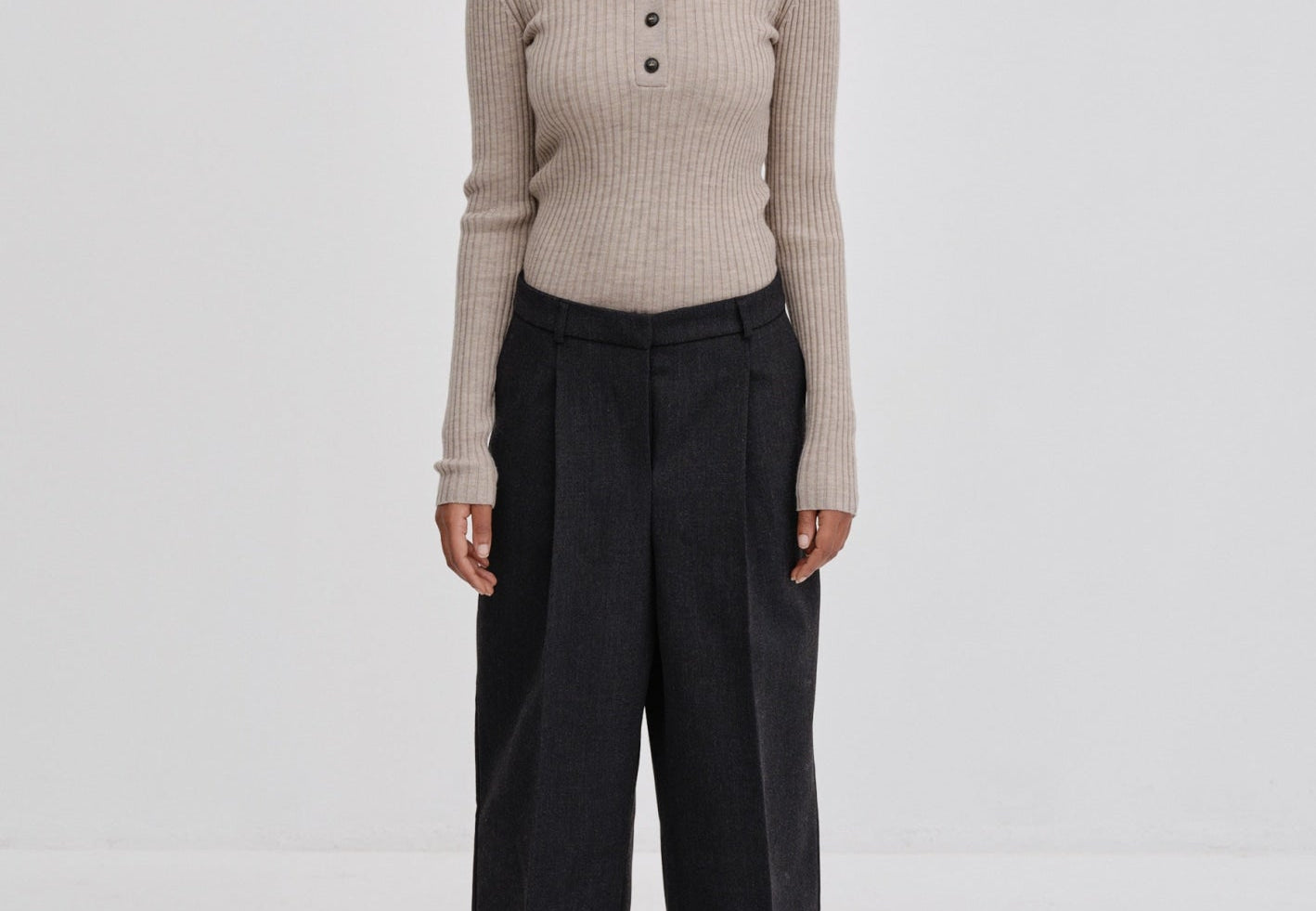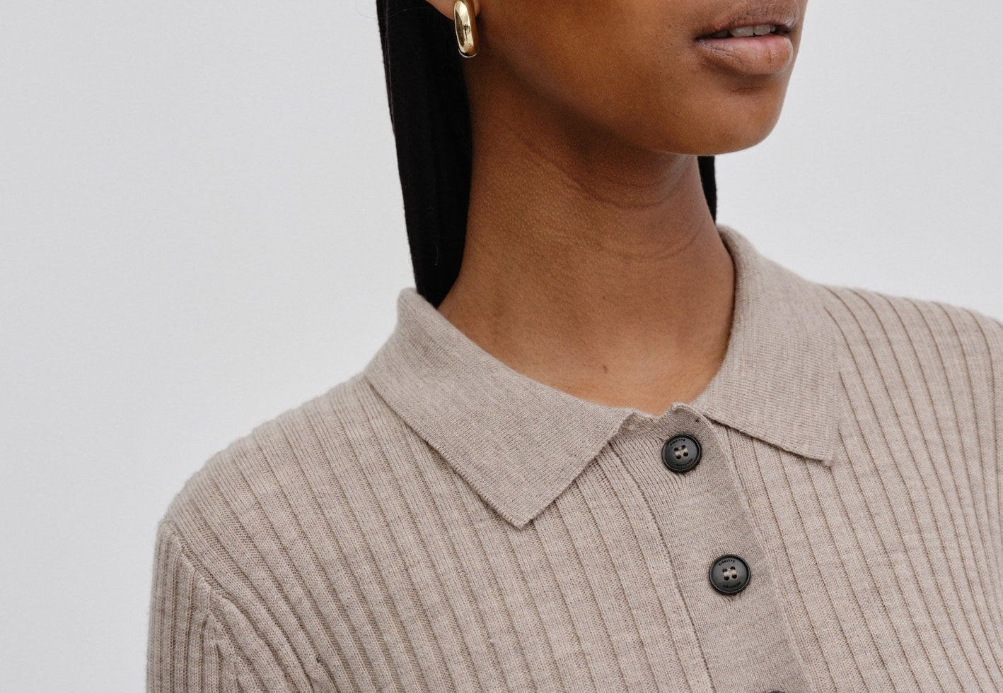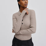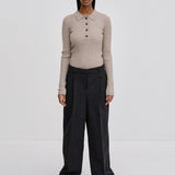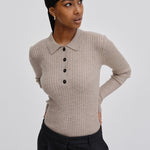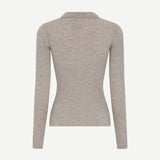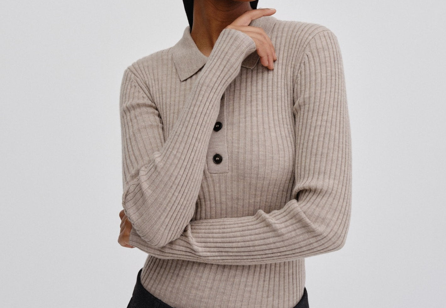 Our polo neck blouse, crafted in 2x2 rib with a slim fit and regular length, offering a stylish addition to your wardrobe.
