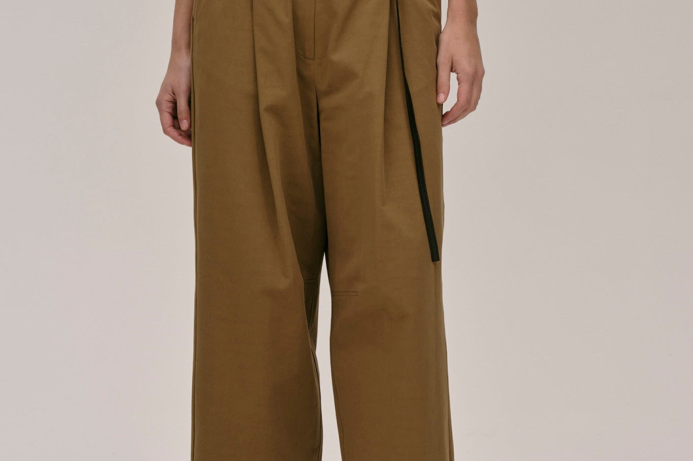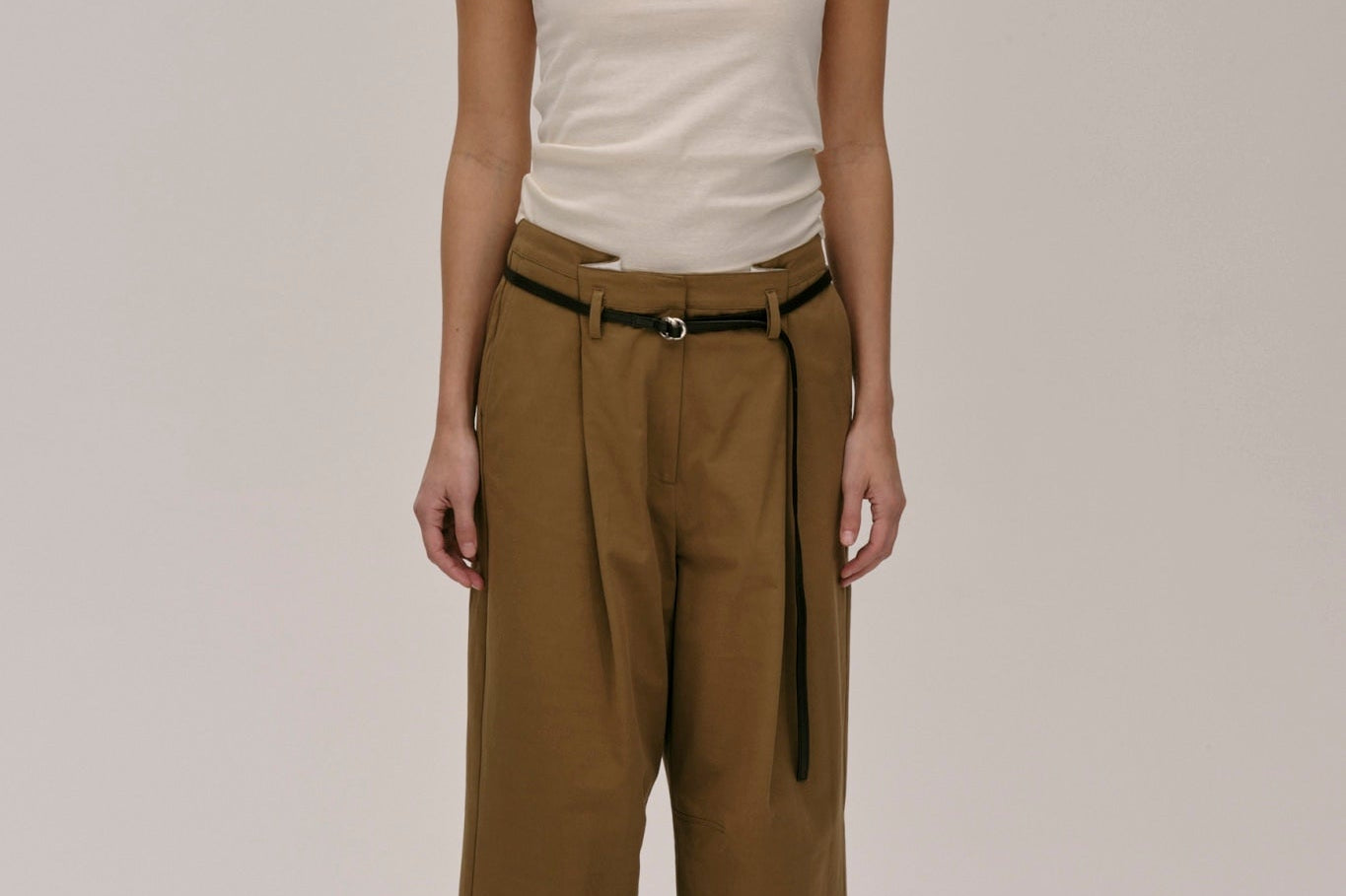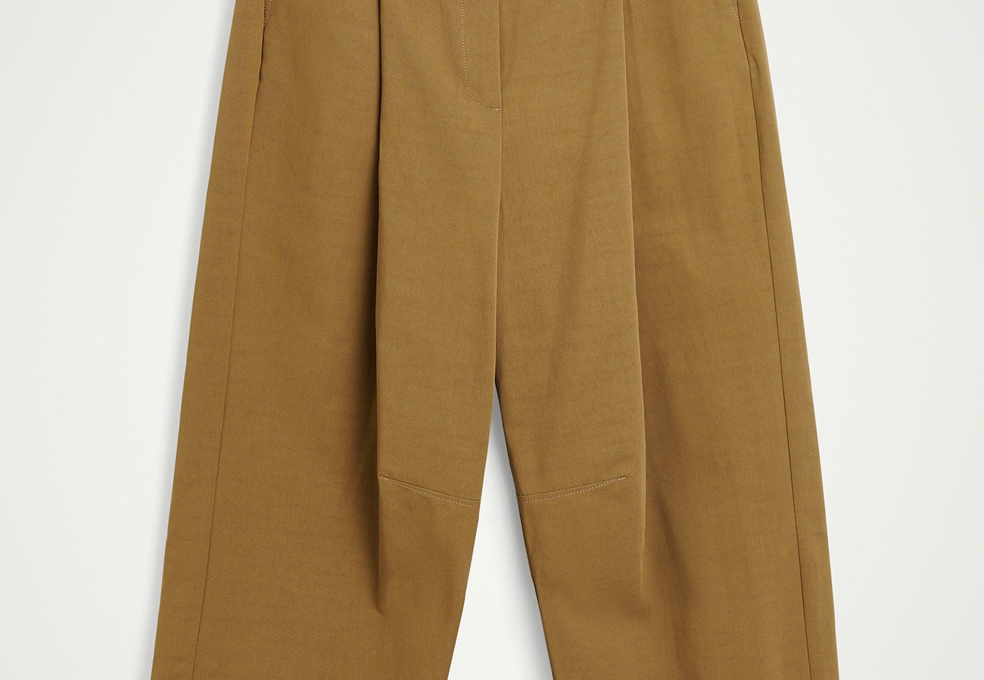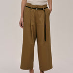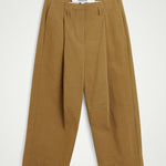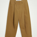 The Carl Pants are cropped, baggy pants that feature folded pleats at the waistband, a slight cocoon shape, and darts at the inseam.
