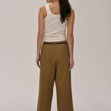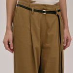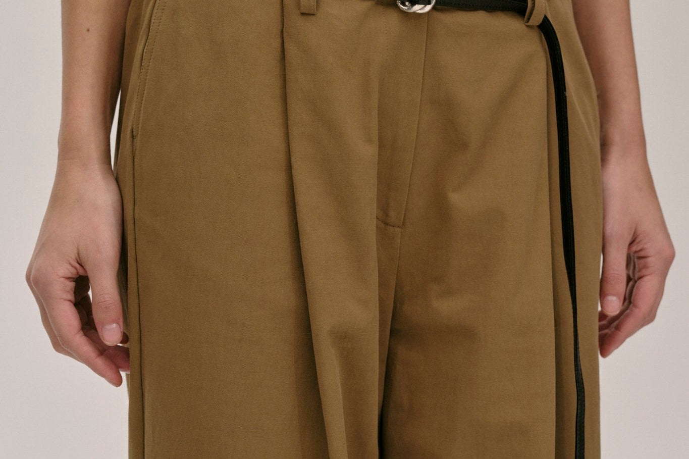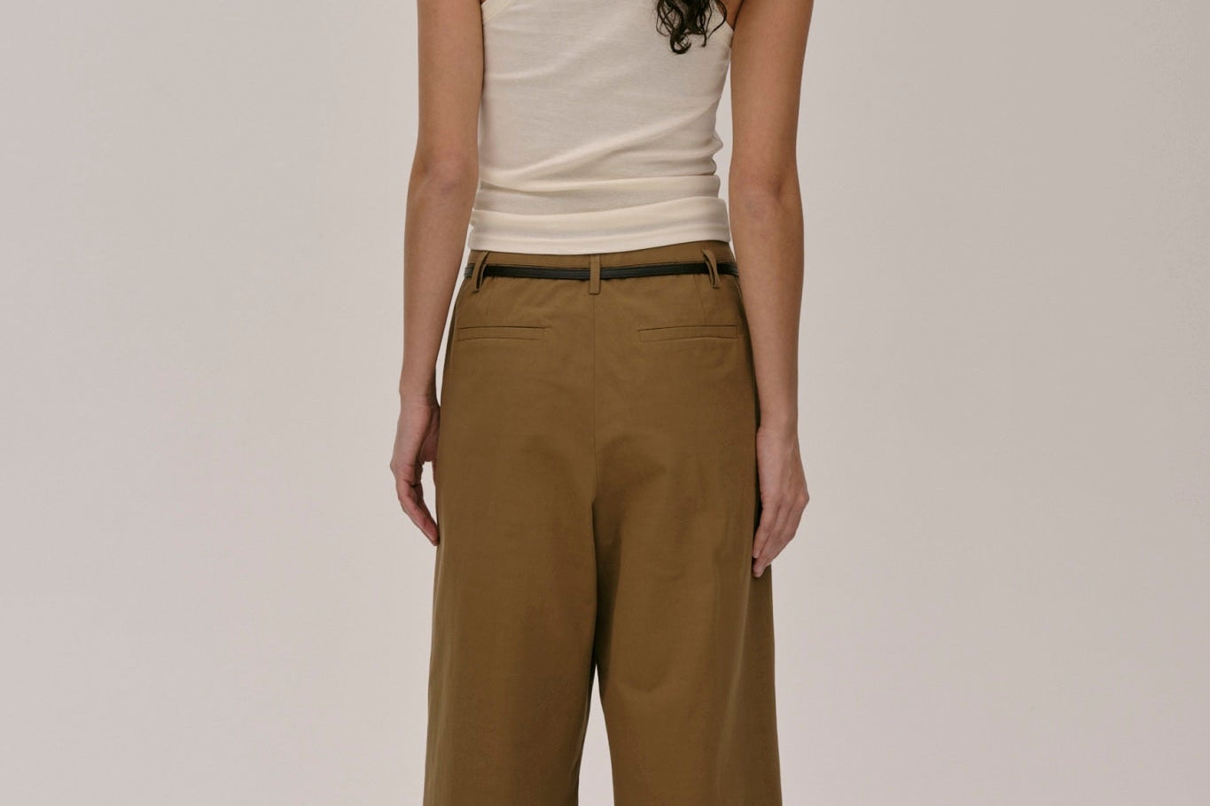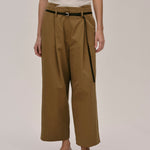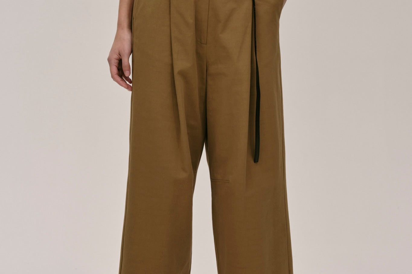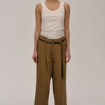 The Carl Pants are cropped, baggy pants that feature folded pleats at the waistband, a slight cocoon shape, and darts at the inseam.