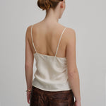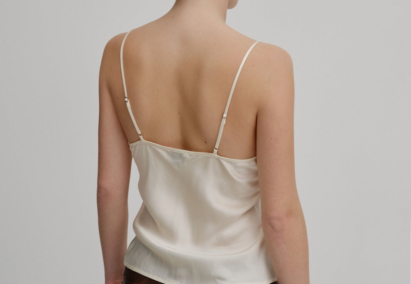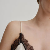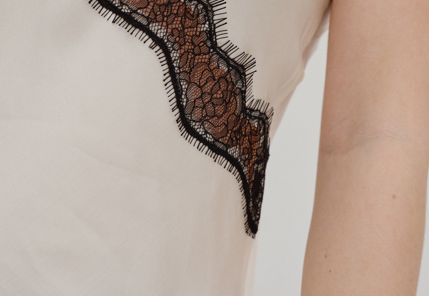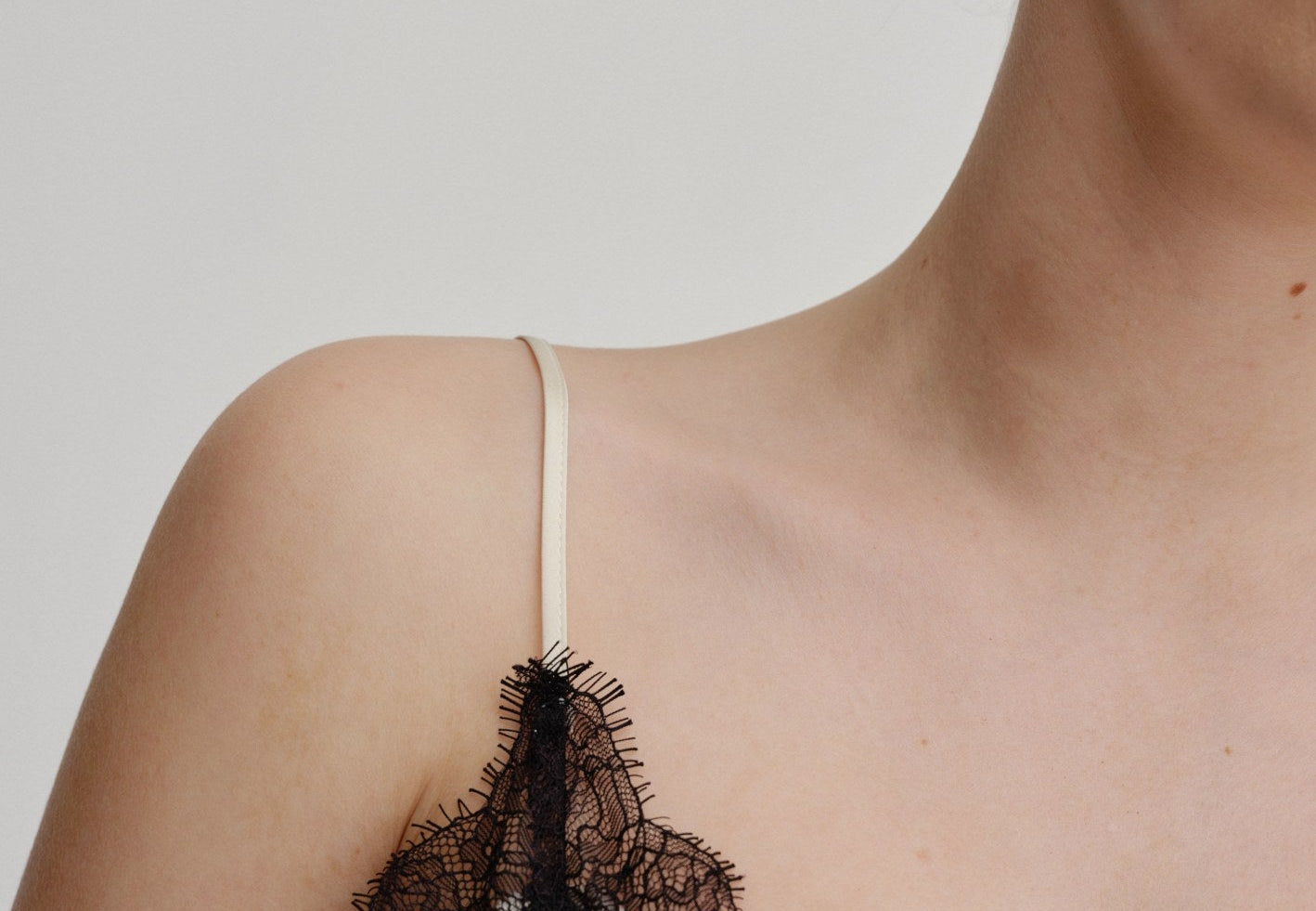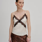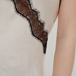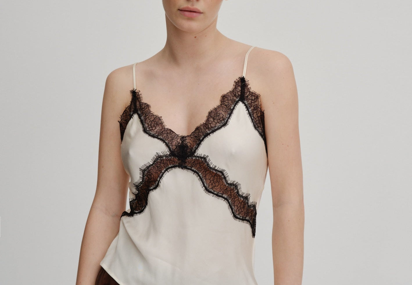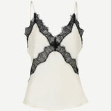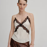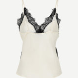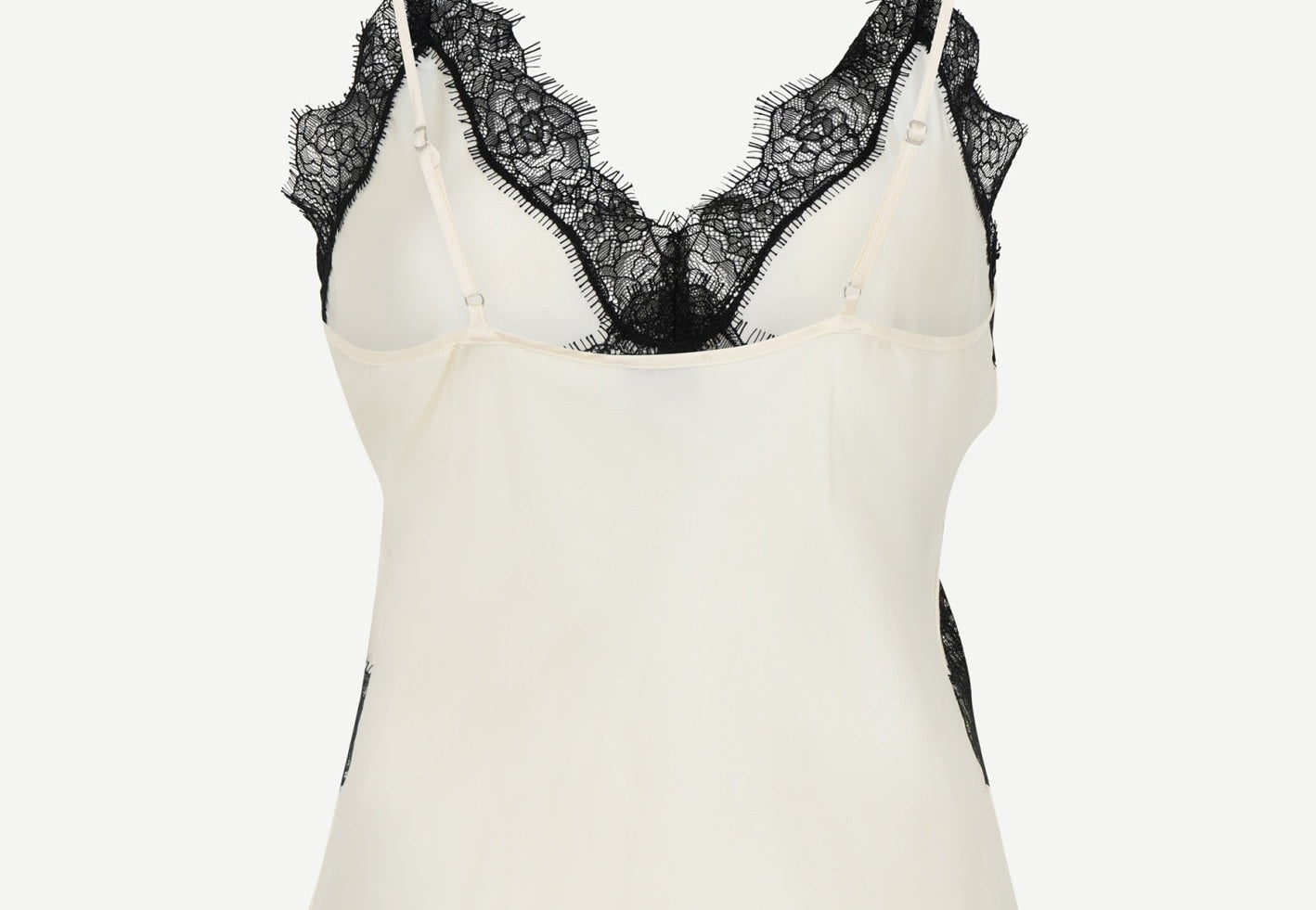Slip top with inserted lace parts, featuring a regular fit and thin shoulder straps. Available in black, fossil and gardenia color.