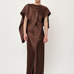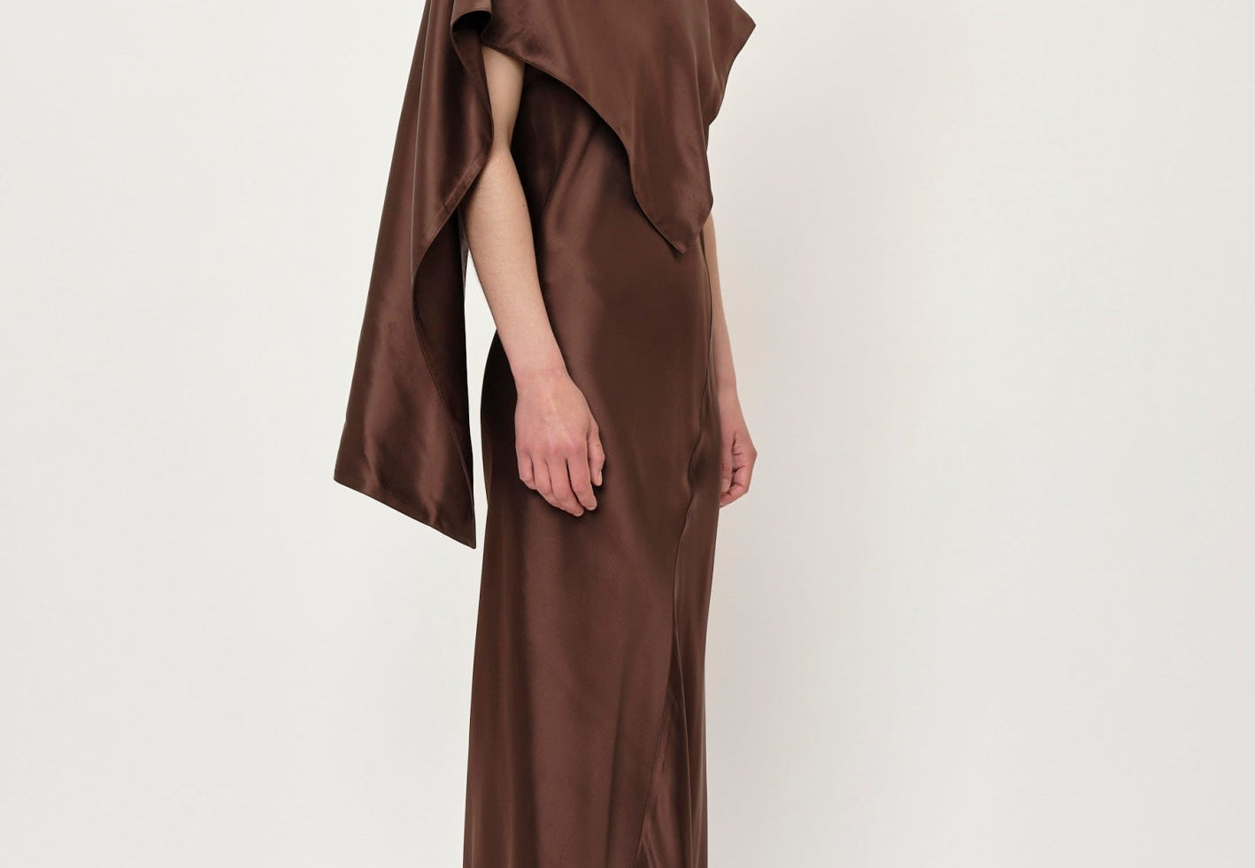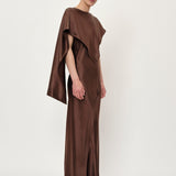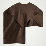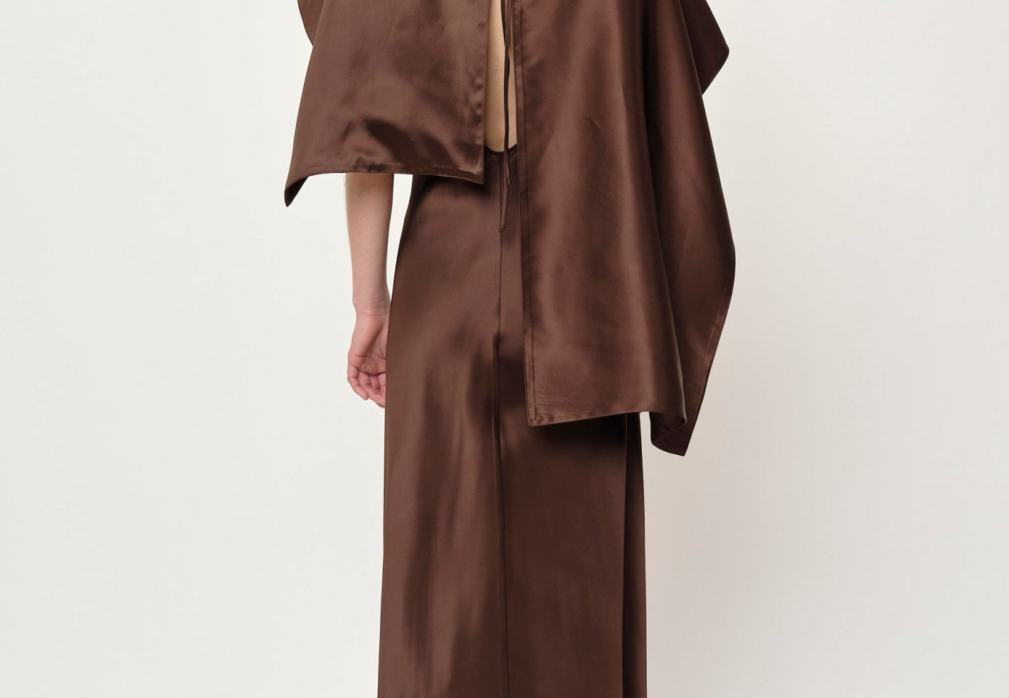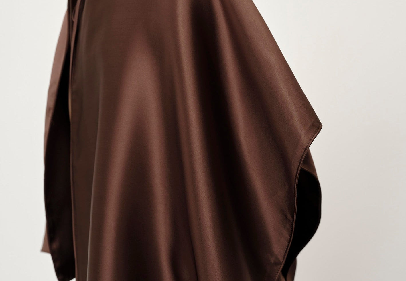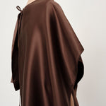 Introducing the Kate Cape: An asymmetrically cut cape designed with tie straps at the back for a customizable fit.
