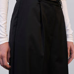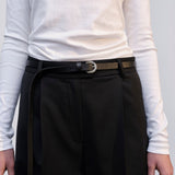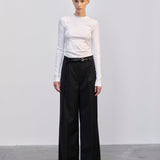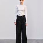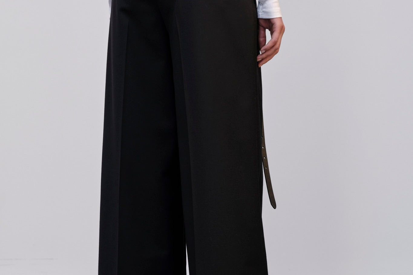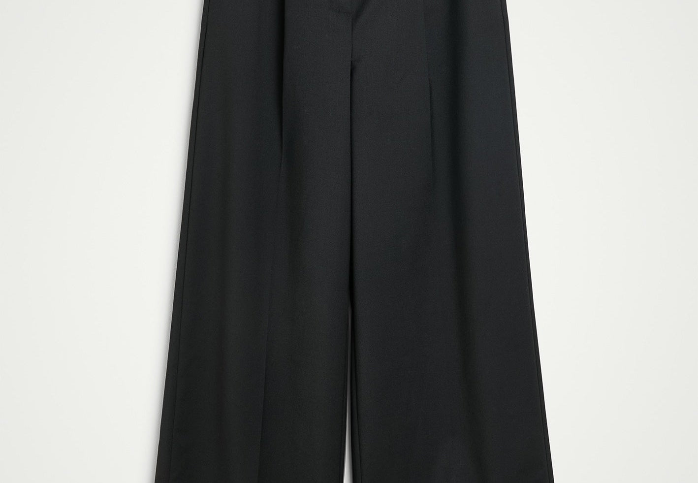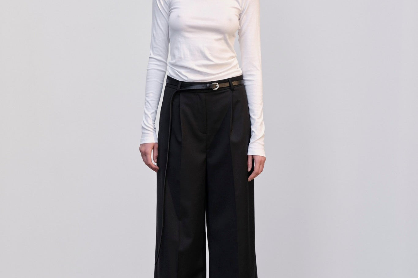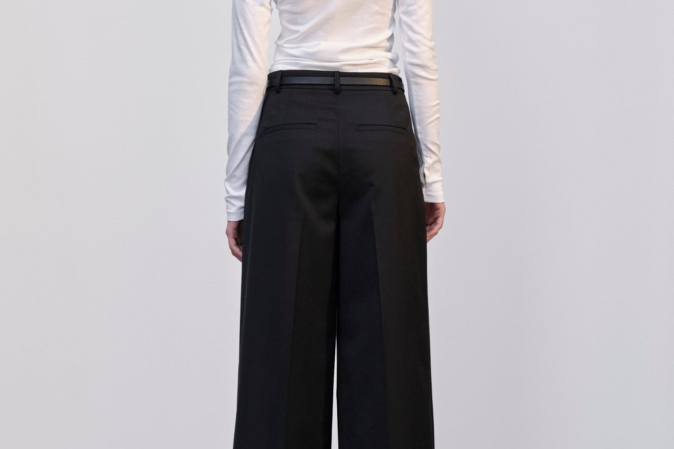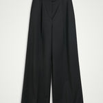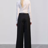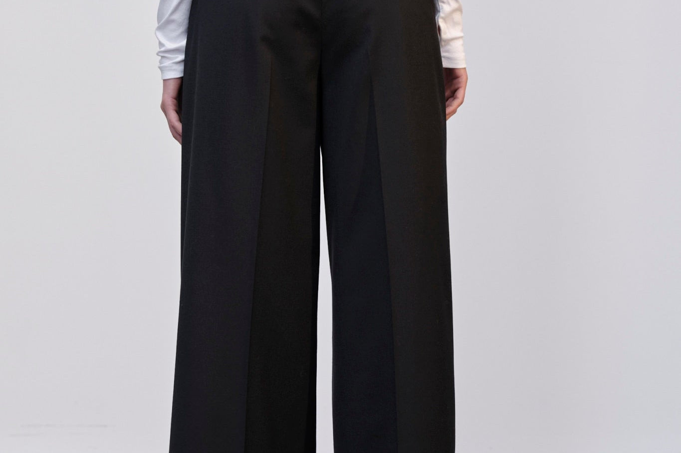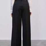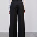 Introducing the Kelly Pants: Classic, mid-waisted long pants featuring two pleats at the front, a crease line for a tailored look, and a long cut.