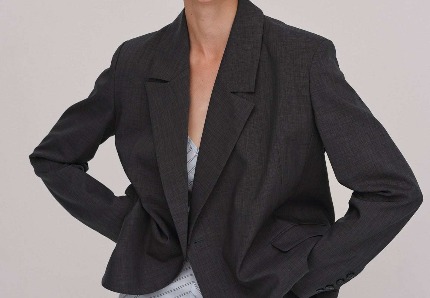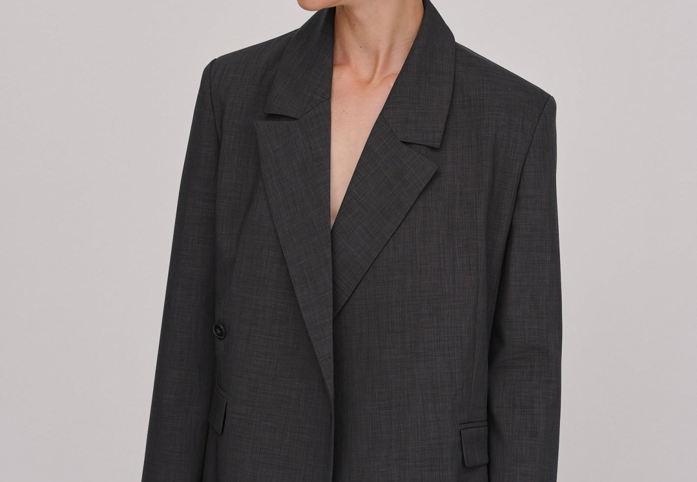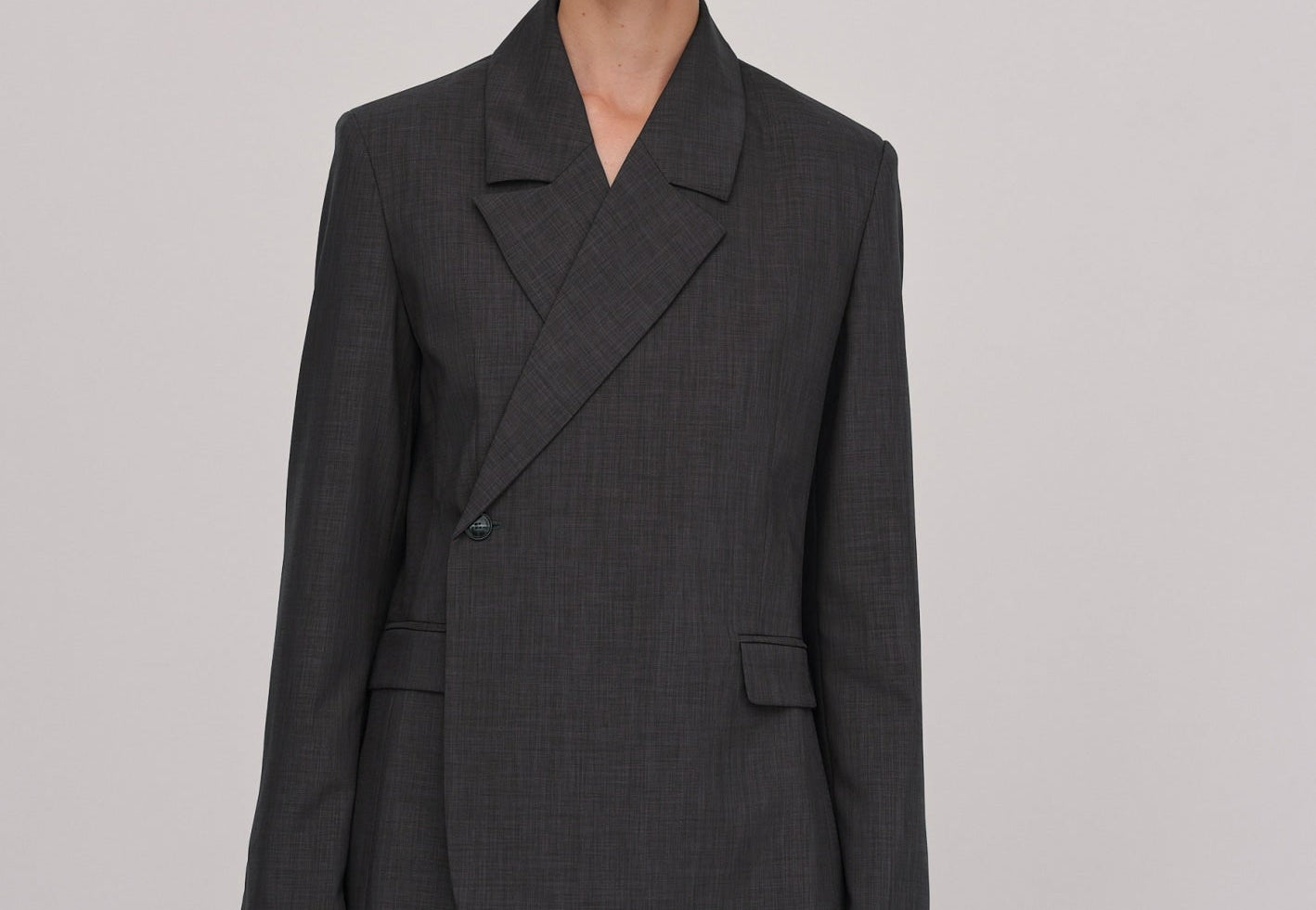 The Lillith Blazer is a casual fit blazer featuring an asymmetric button closure on the front, padded shoulders, functional chest and front pockets, and cuff slits with workable button closures.