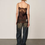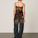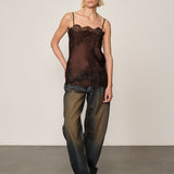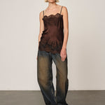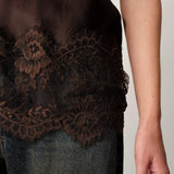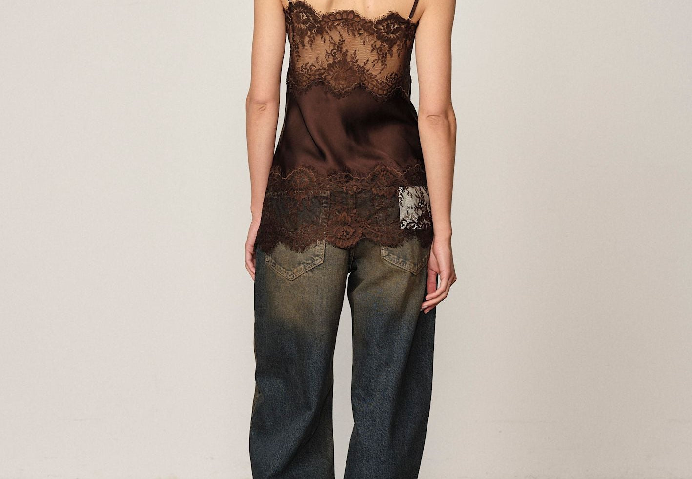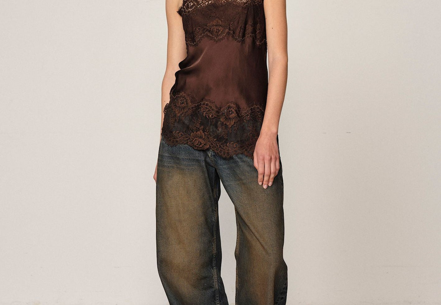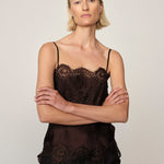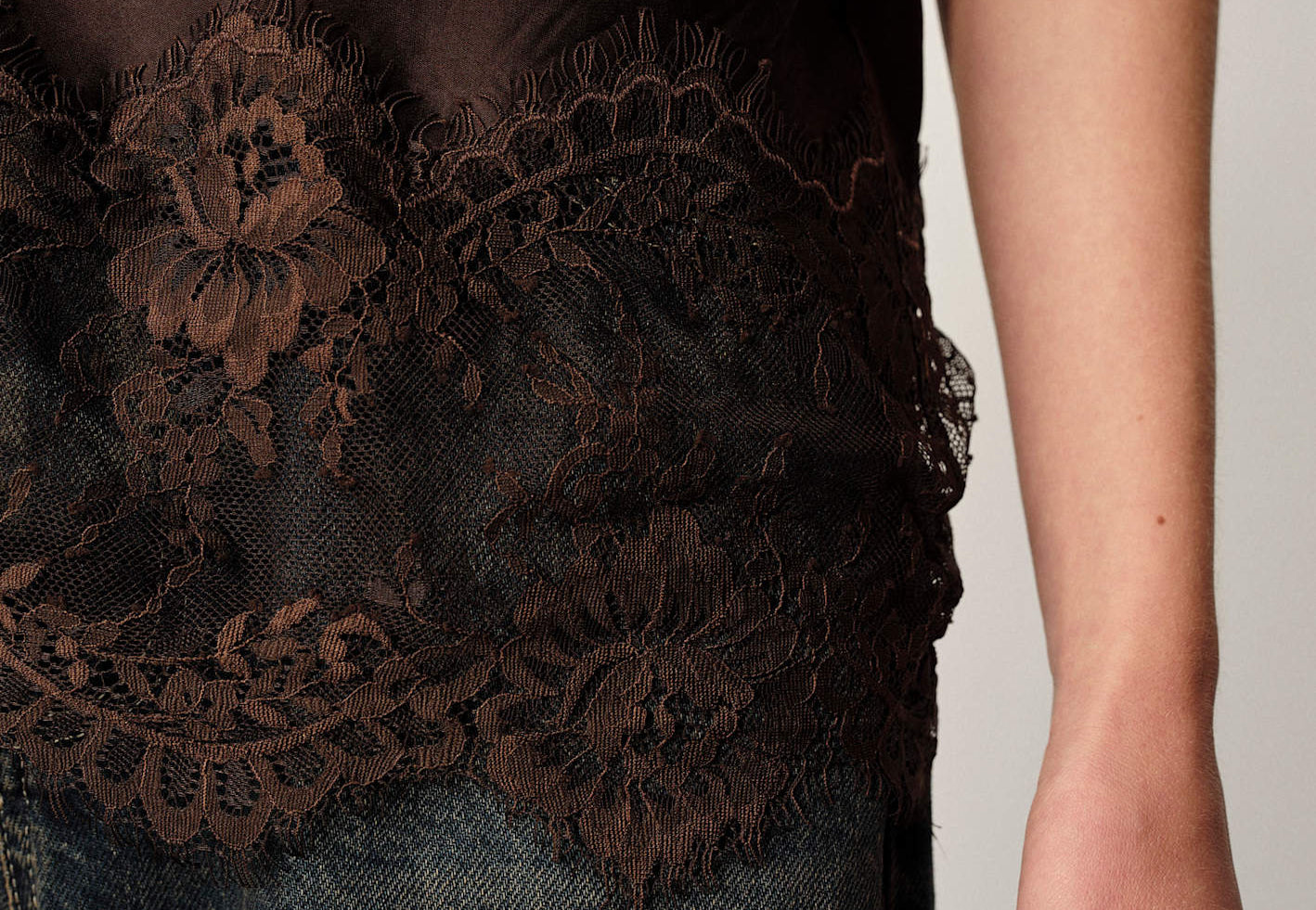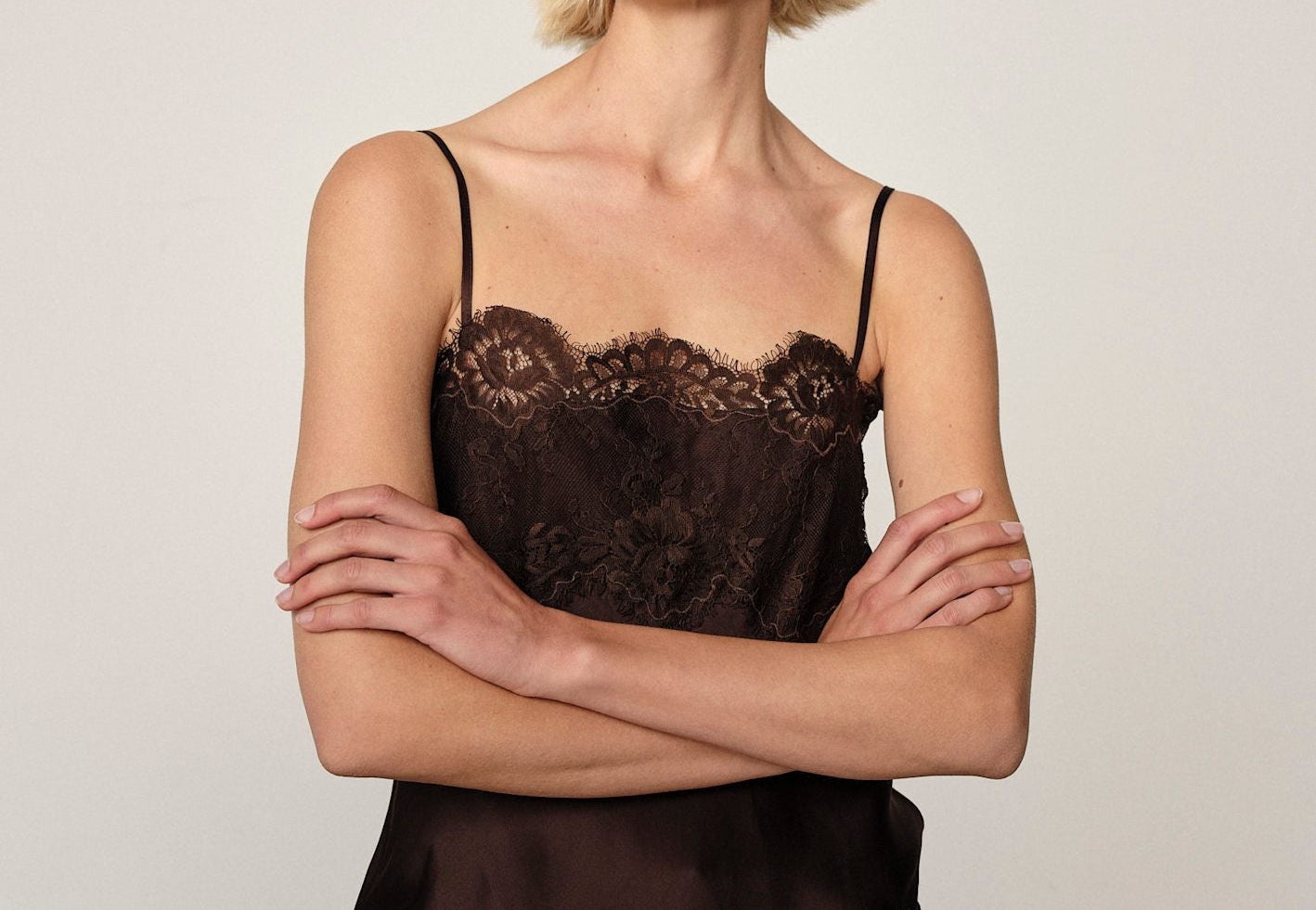 A returning favorite, designed in smooth satin with delicate lace detailing along neckline and hem. Available this season in light blue with crème lace and dark brown. A timeless piece that transitions effortlessly from day to evening.