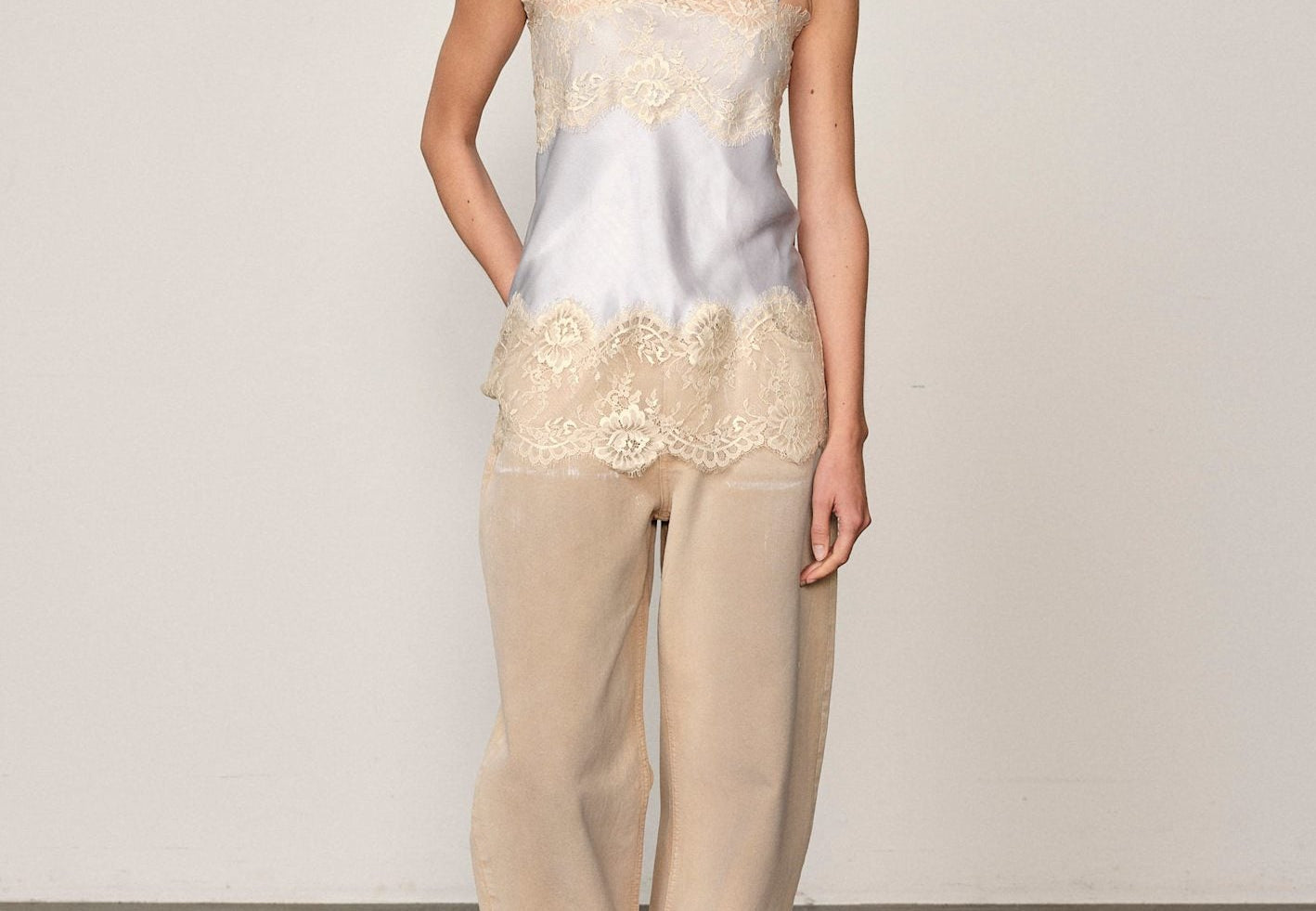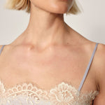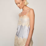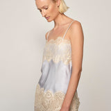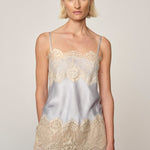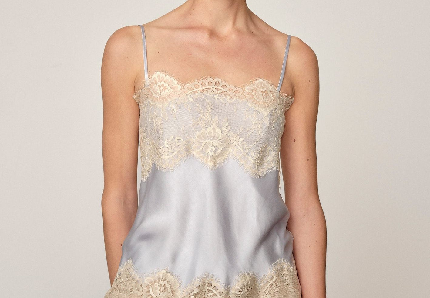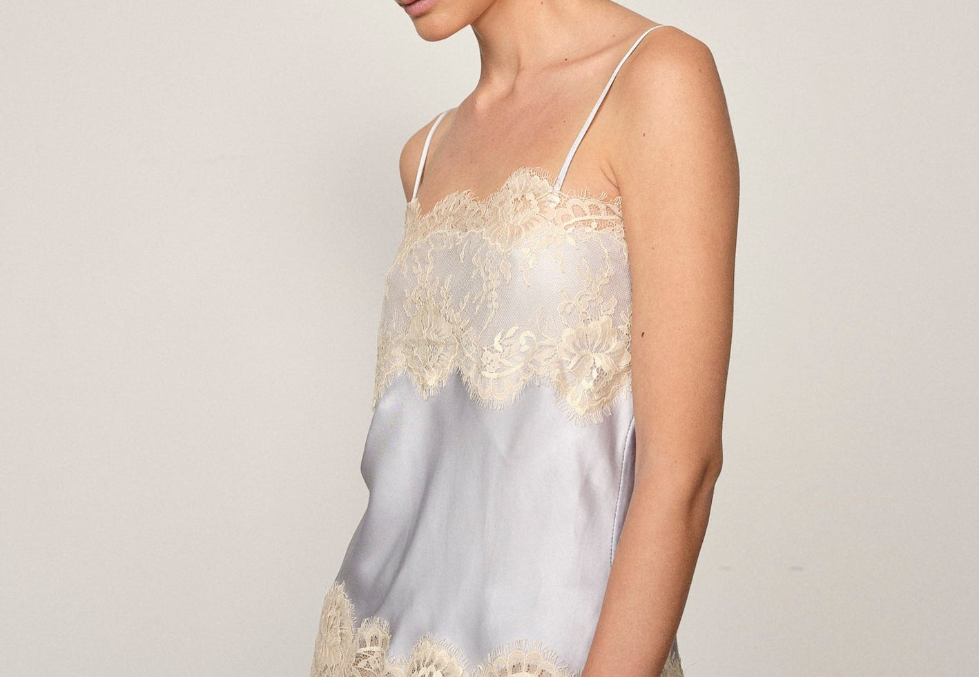A returning favorite, designed in smooth satin with delicate lace detailing along neckline and hem. Available this season in light blue with crème lace and dark brown. A timeless piece that transitions effortlessly from day to evening.