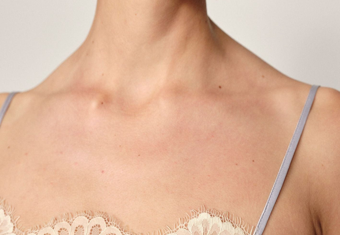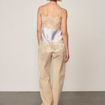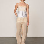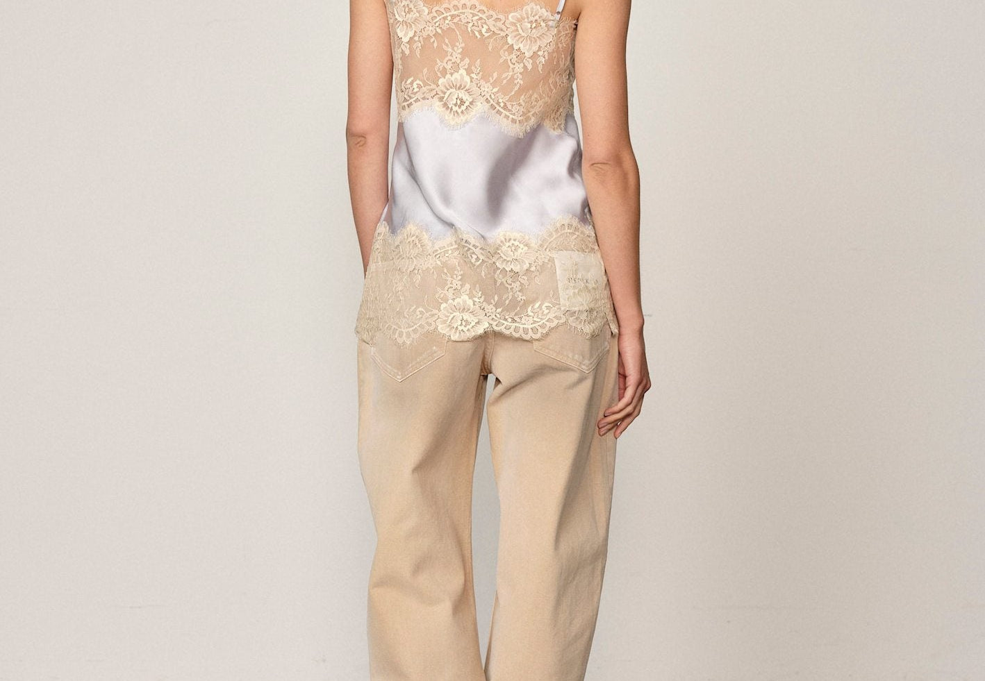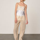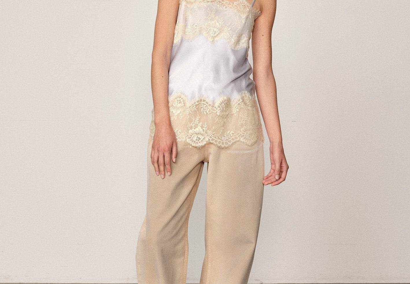 A returning favorite, designed in smooth satin with delicate lace detailing along neckline and hem. Available this season in light blue with crème lace and dark brown. A timeless piece that transitions effortlessly from day to evening.