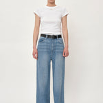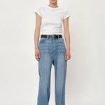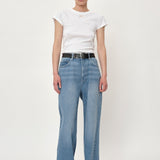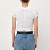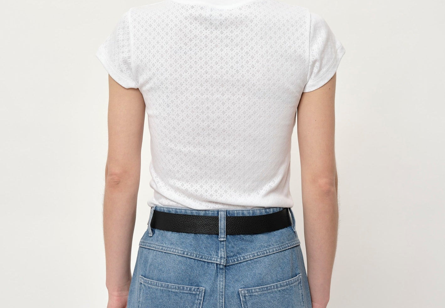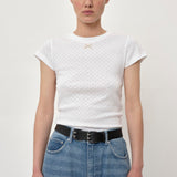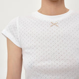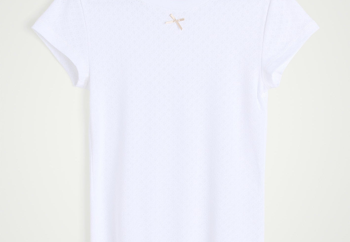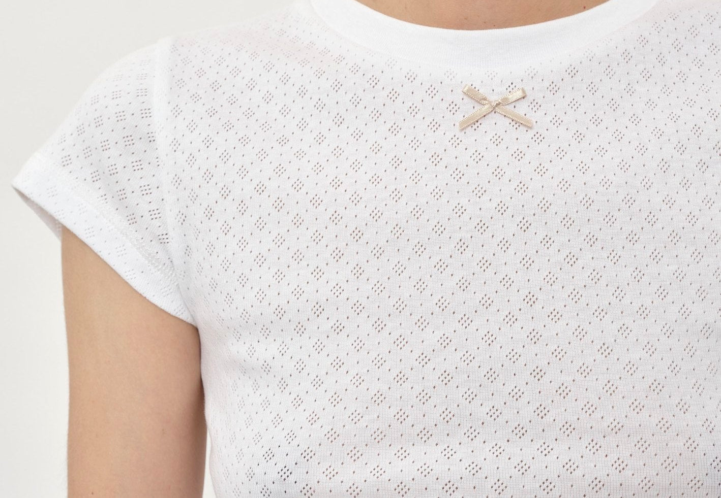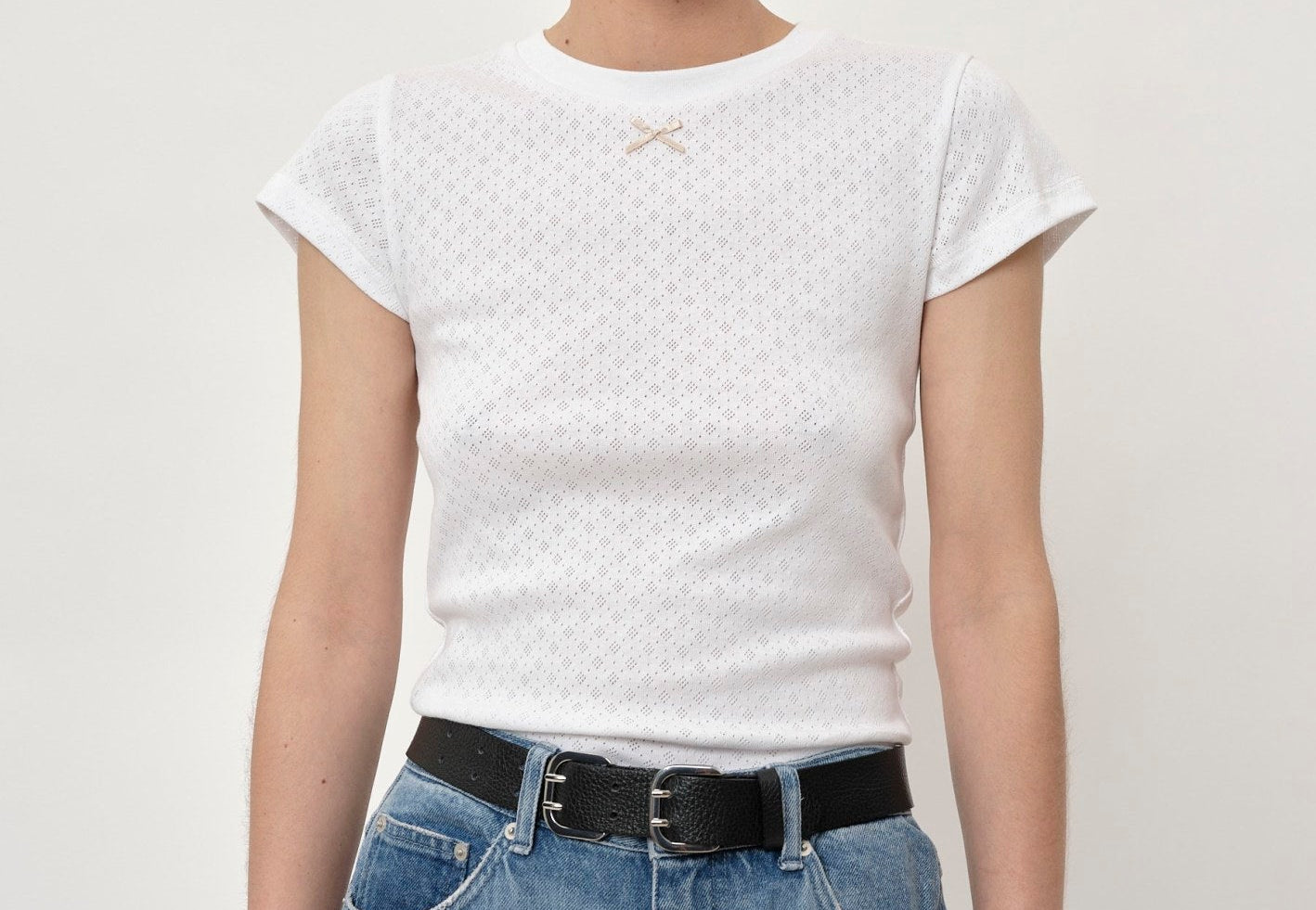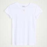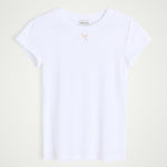 Introducing the Ludo Blouse: A fitted short-sleeve t-shirt crafted from 100% organic cotton. It features a round neckline and a small bow detail.