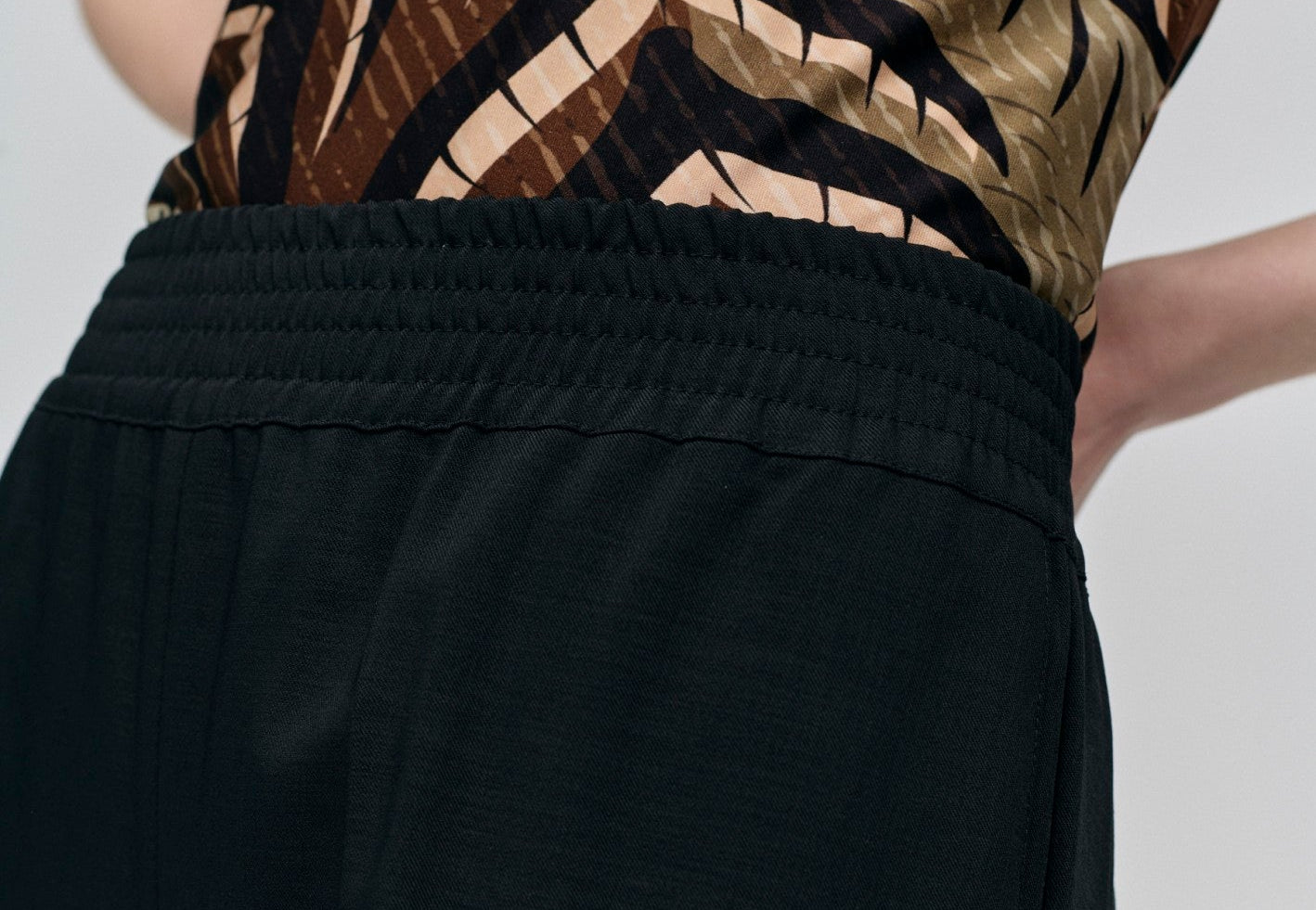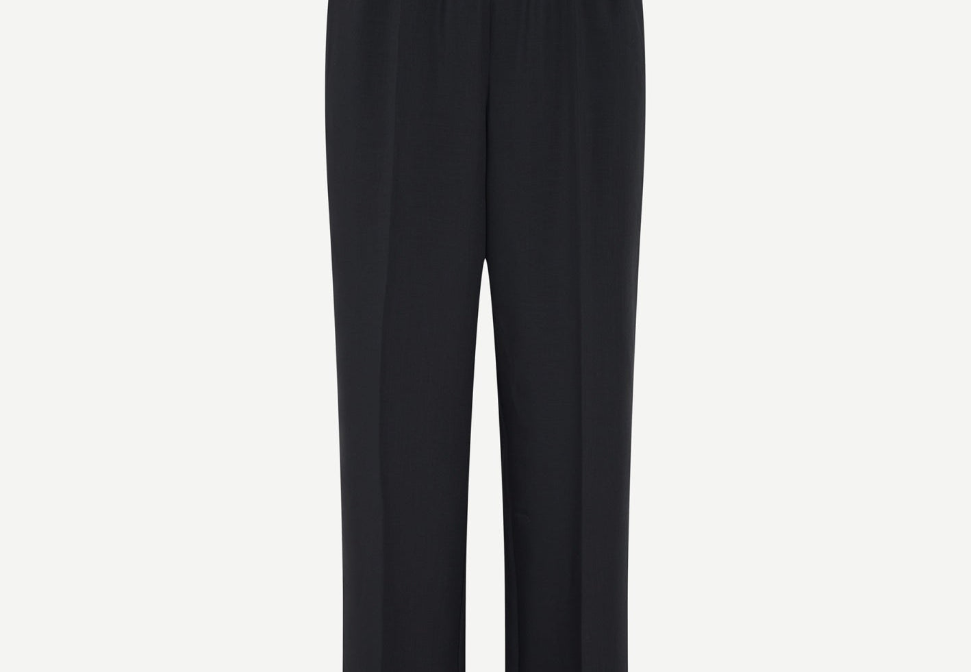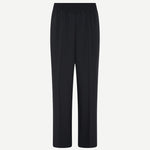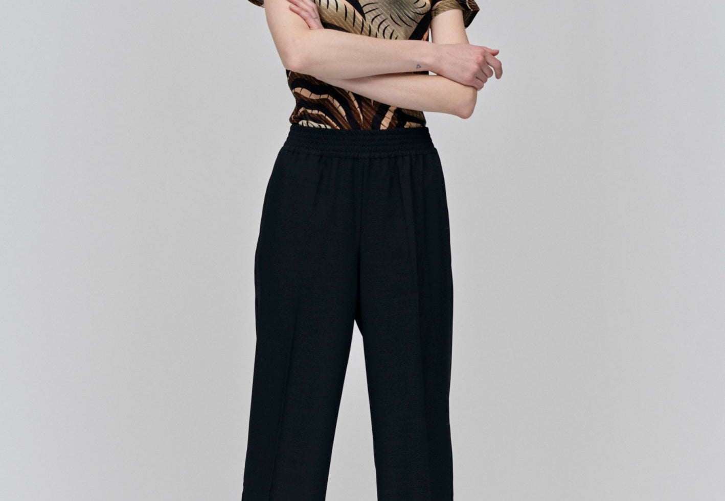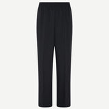 Casual style pants with a loose fit, mid-rise waist, elastic waistband, and wide leg with press crease in front and back.