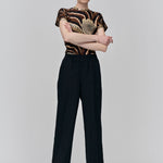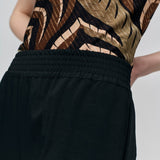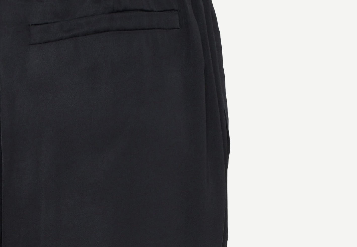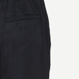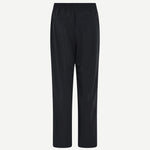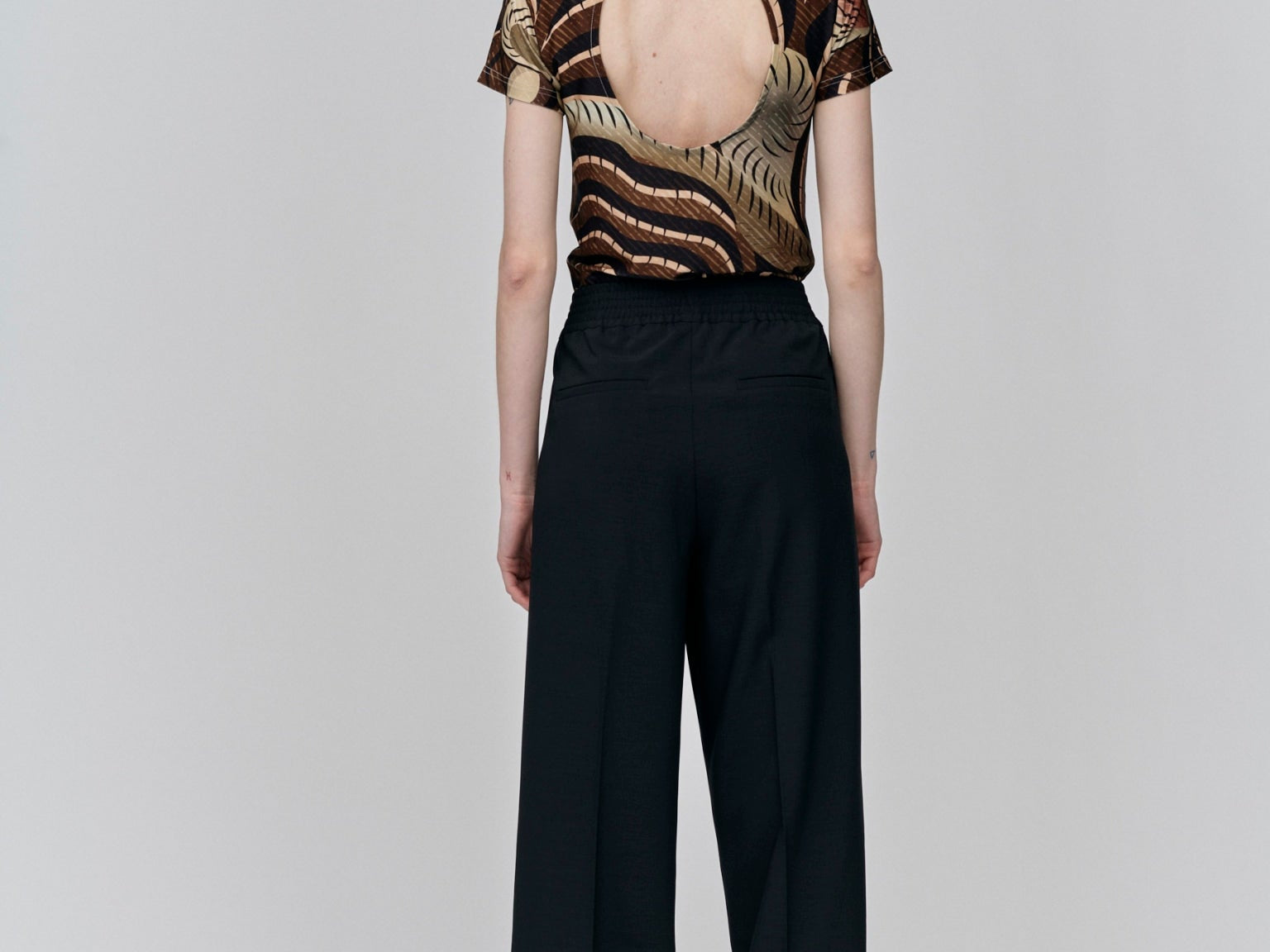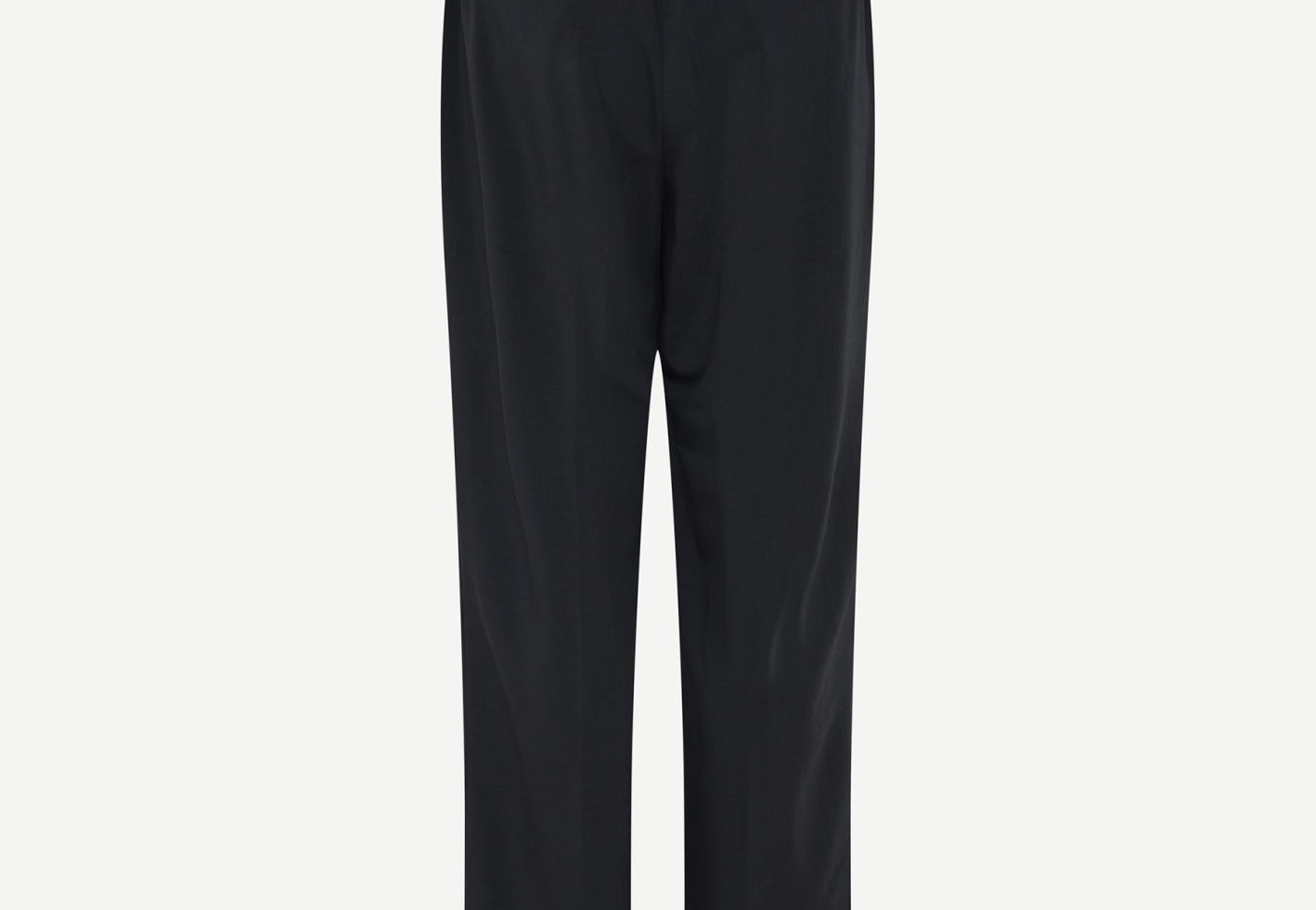 Casual style pants with a loose fit, mid-rise waist, elastic waistband, and wide leg with press crease in front and back.