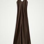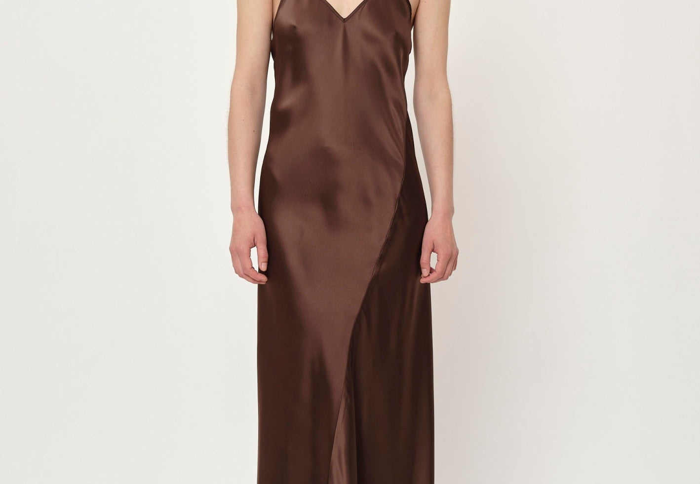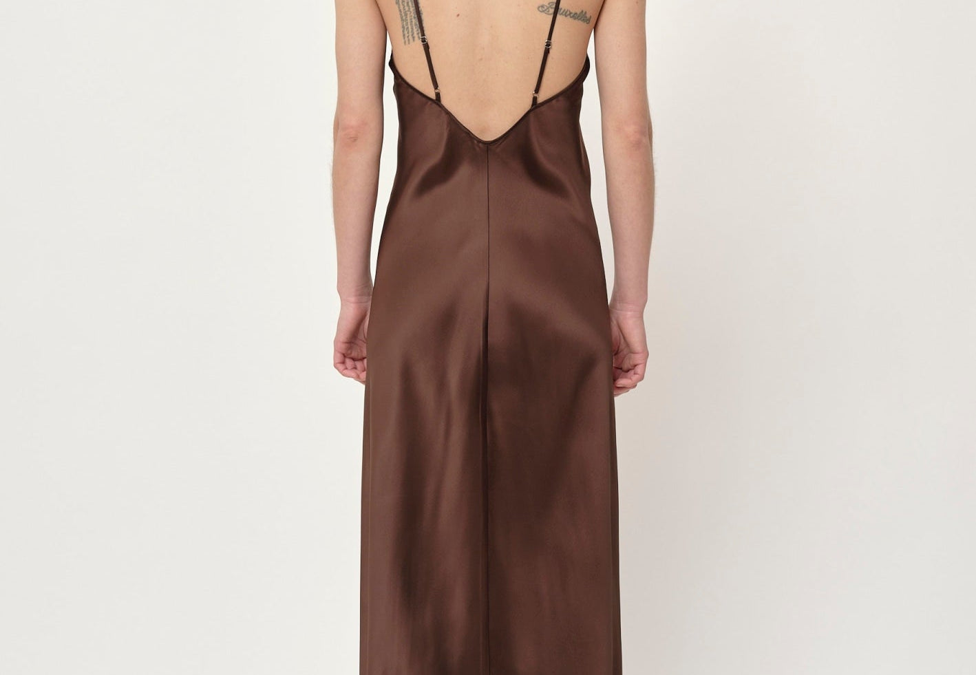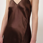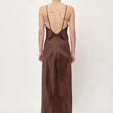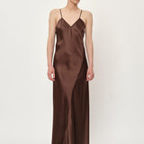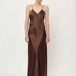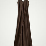 Introducing the Renate Dress: A long slip dress cut on the bias, which allows it to drape elegantly against the body. The dress features a deep V-neck, a low back cut, and thin adjustable straps.