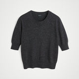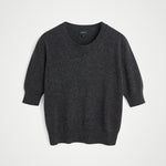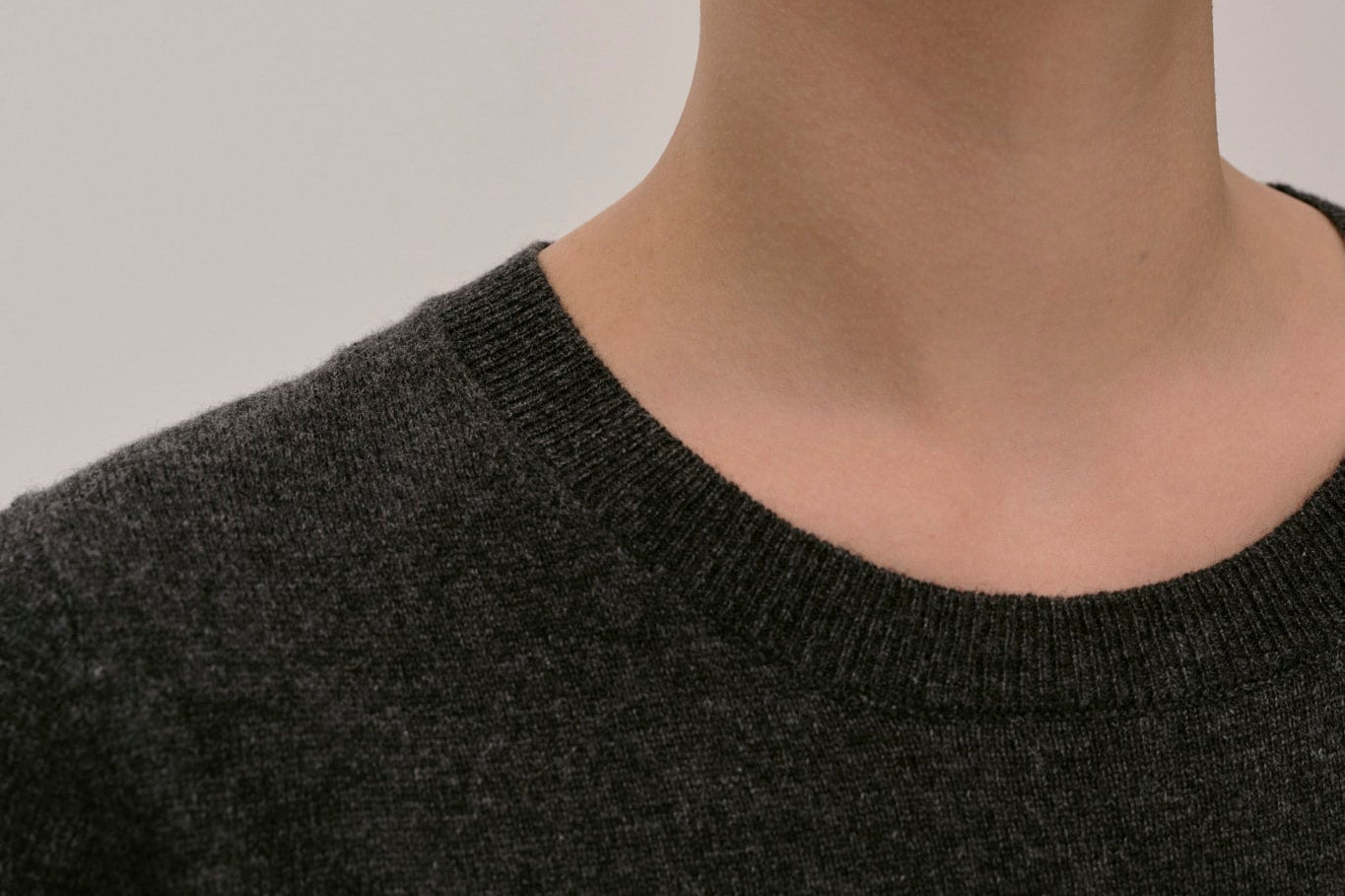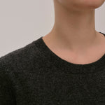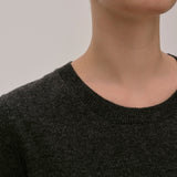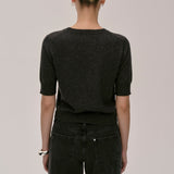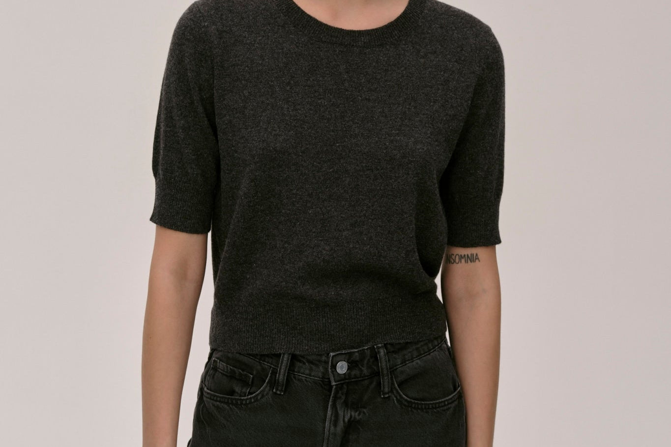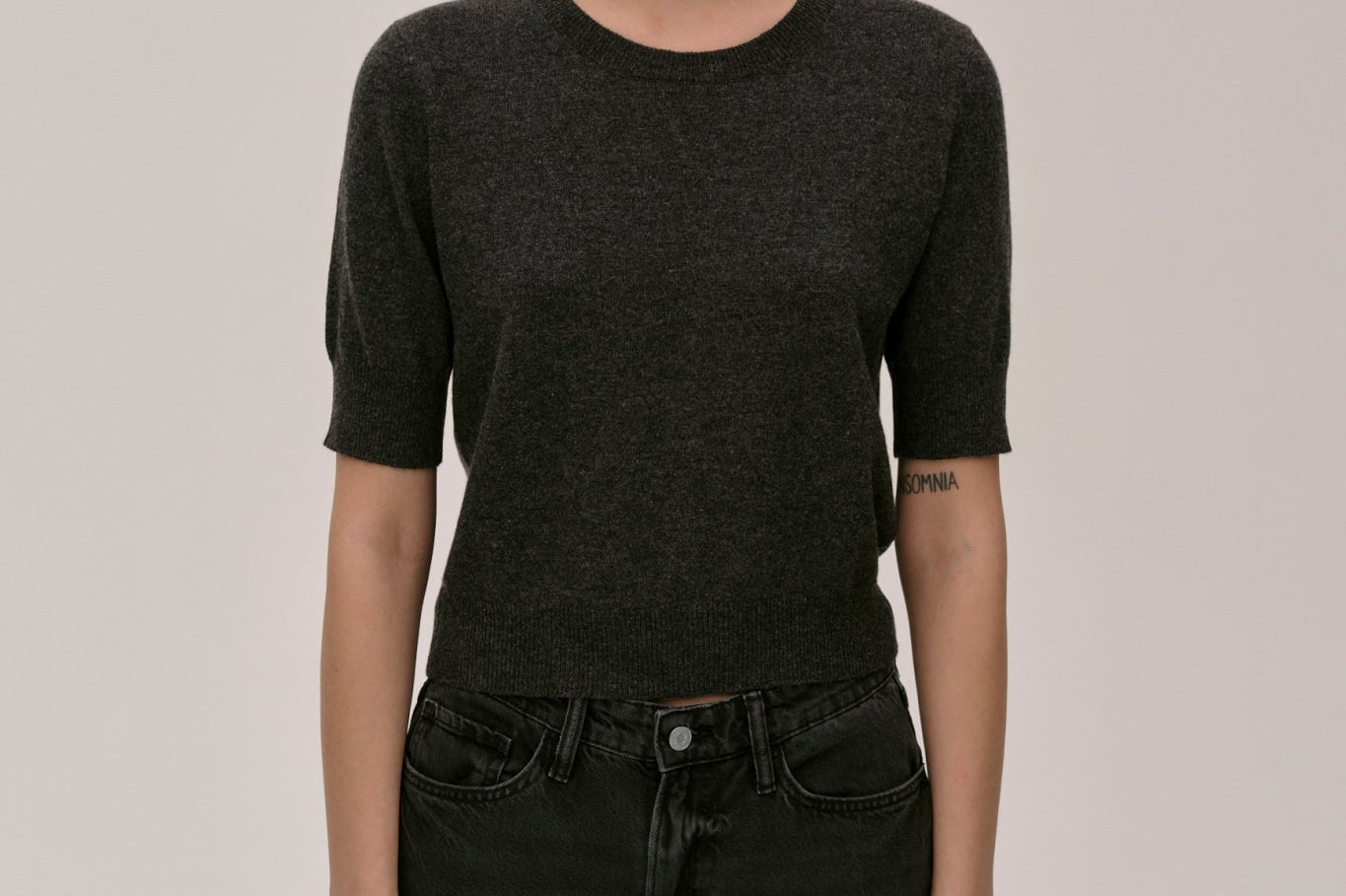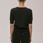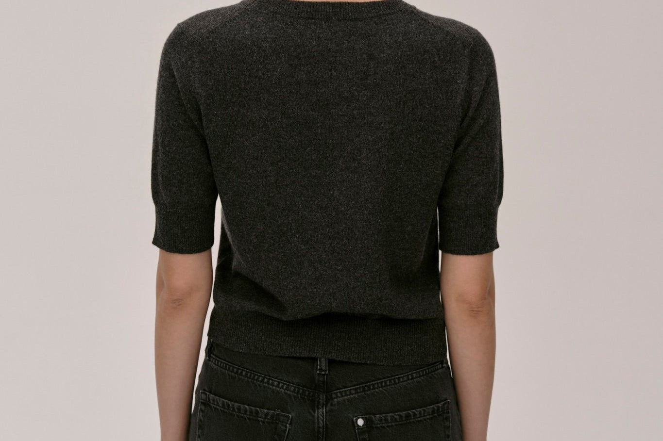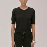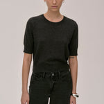 The Therese Knit Blouse is a round neck tee. The length extends to the waist.